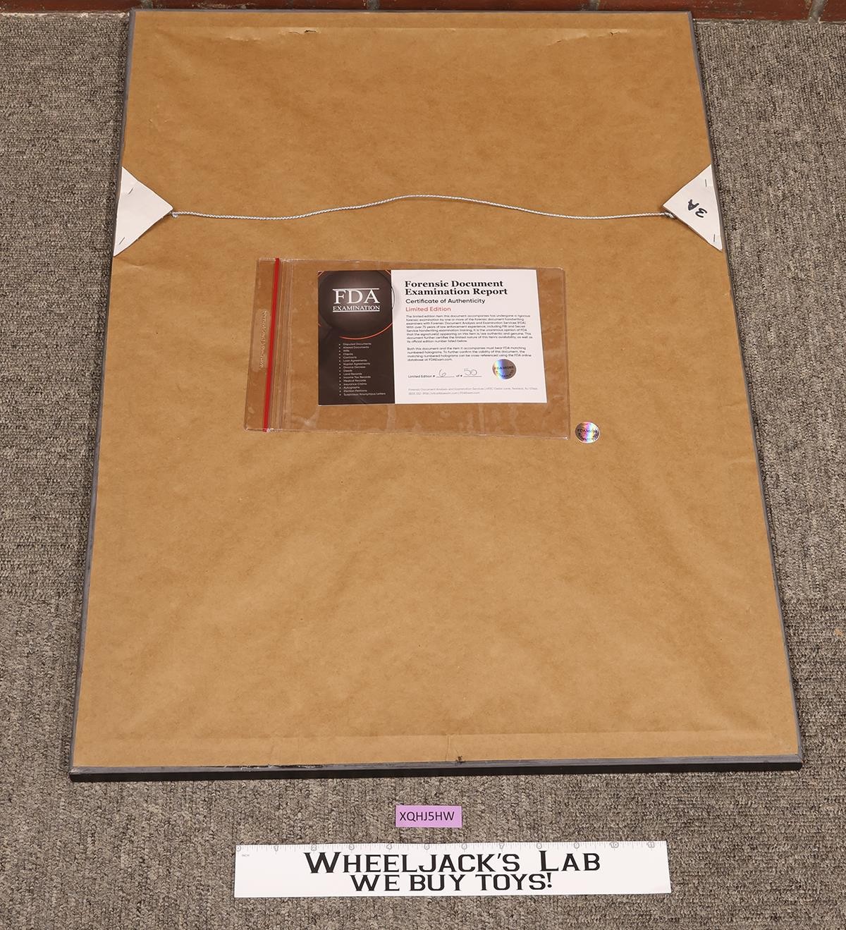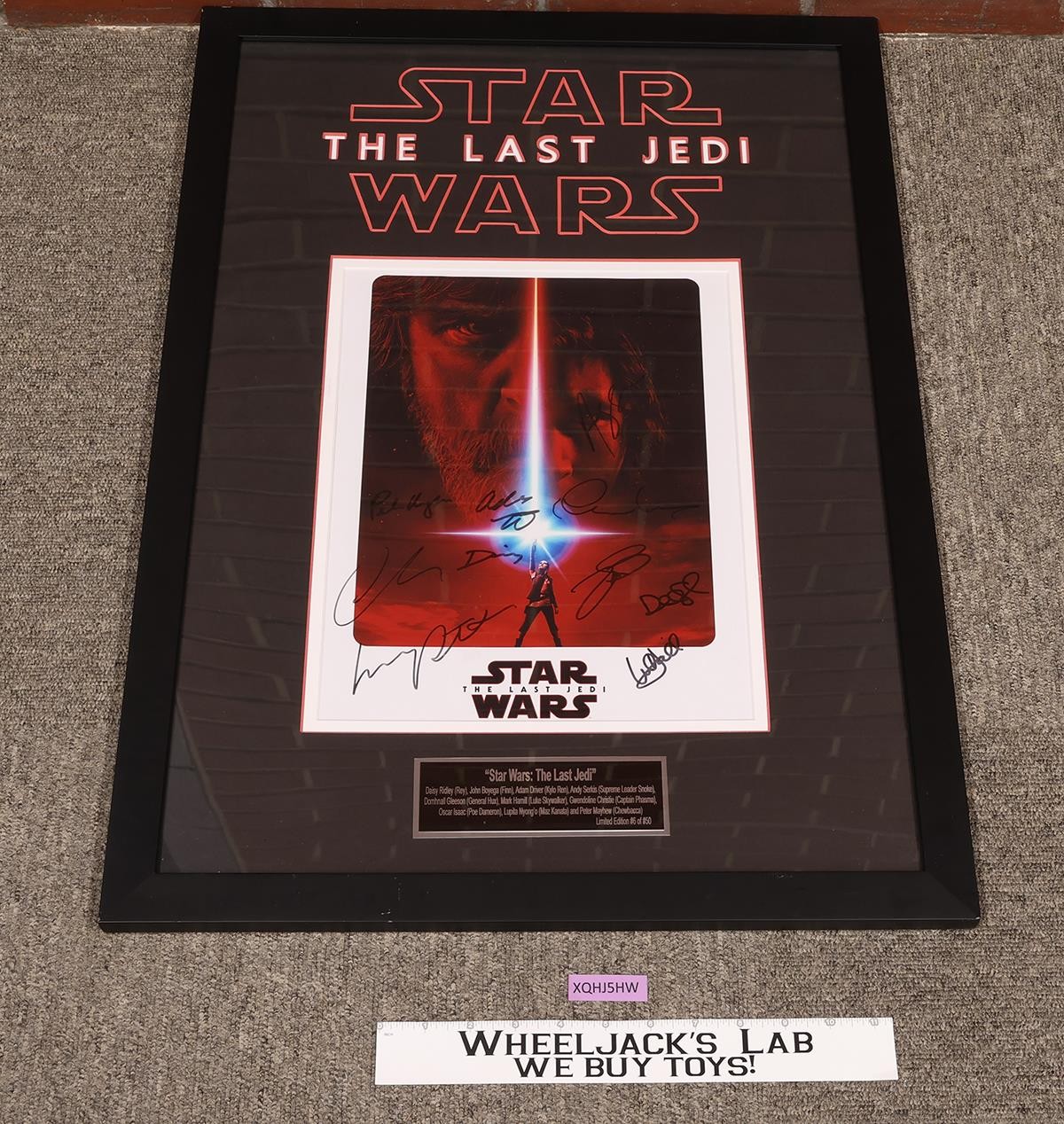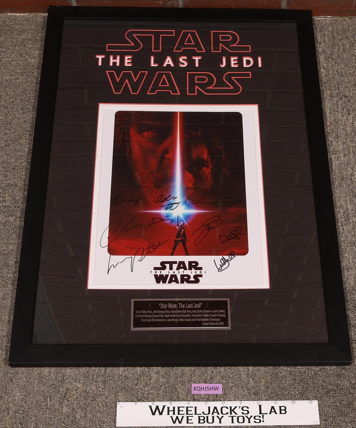 Condition: The item has light wear. The plastic cover on the front has scuffs and scratches. Autographed by Daisy Ridley, John Boyega, Adam Driver, Andy Serkis, Domhnall Gleeson, Mark Hamill, Gwendoline Christie, Oscar Isaac, Lupita Nyong'o, and Peter Mayhew. It includes a certificate of authenticity and is numbered 6 of 50. The image area measures approximately 13 inches x 10.25 inches, and with the frame, it measures 28 inches x 20 inches. Comes as shown.