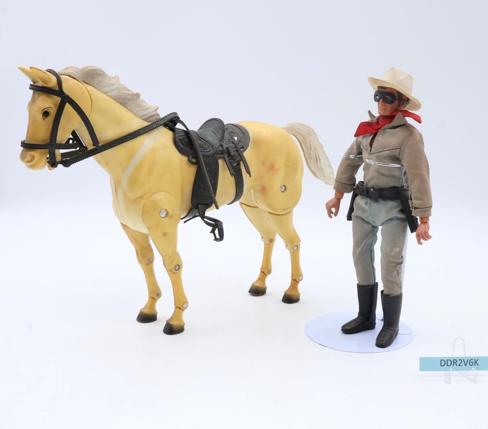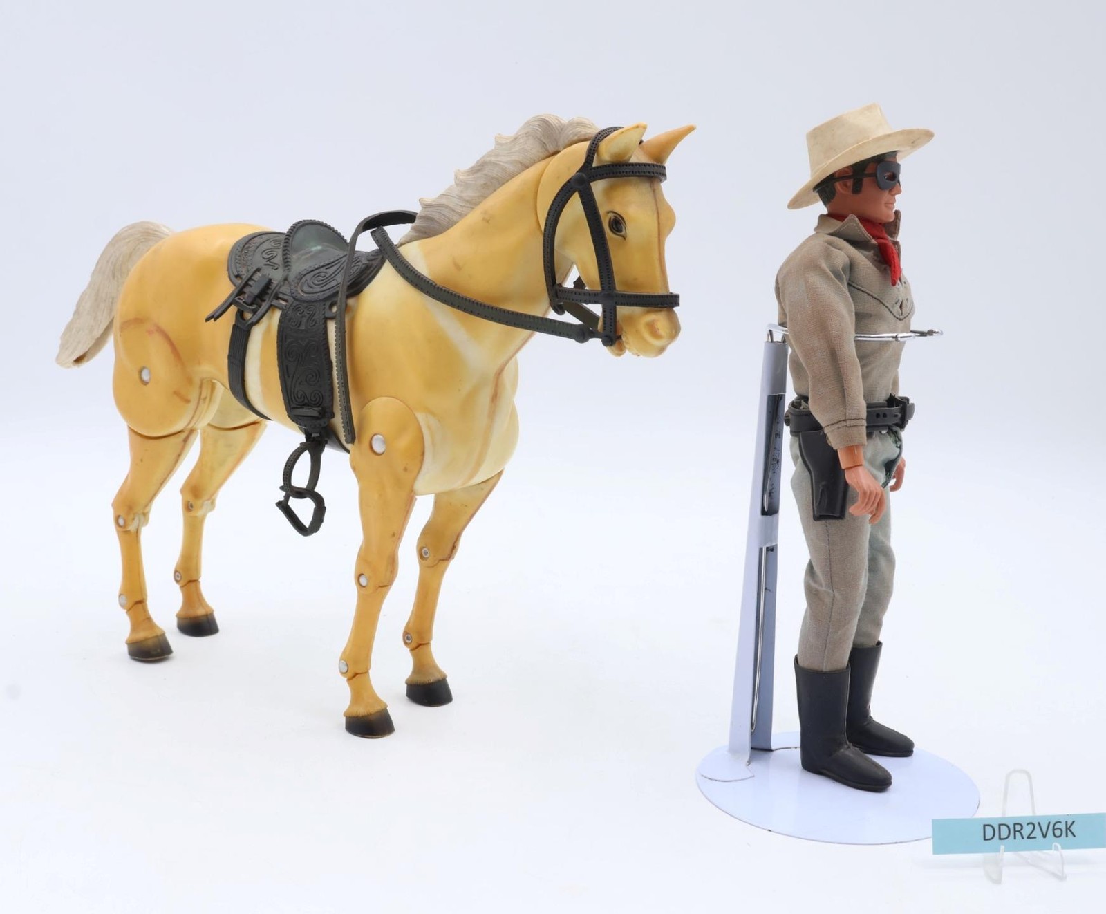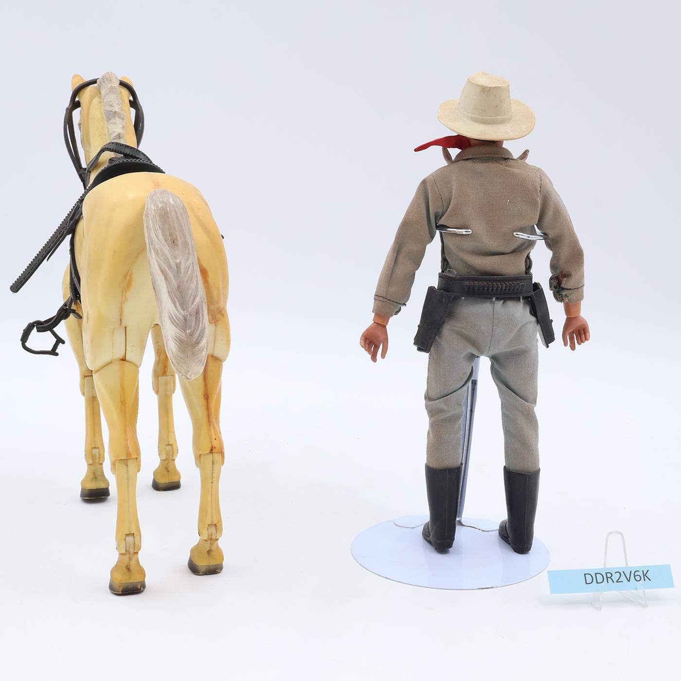 Accessories: The tack is complete except for one piece. Missing one pistol and the stand for the horse. The snaps on the clothing are rusted. Comes as shown.