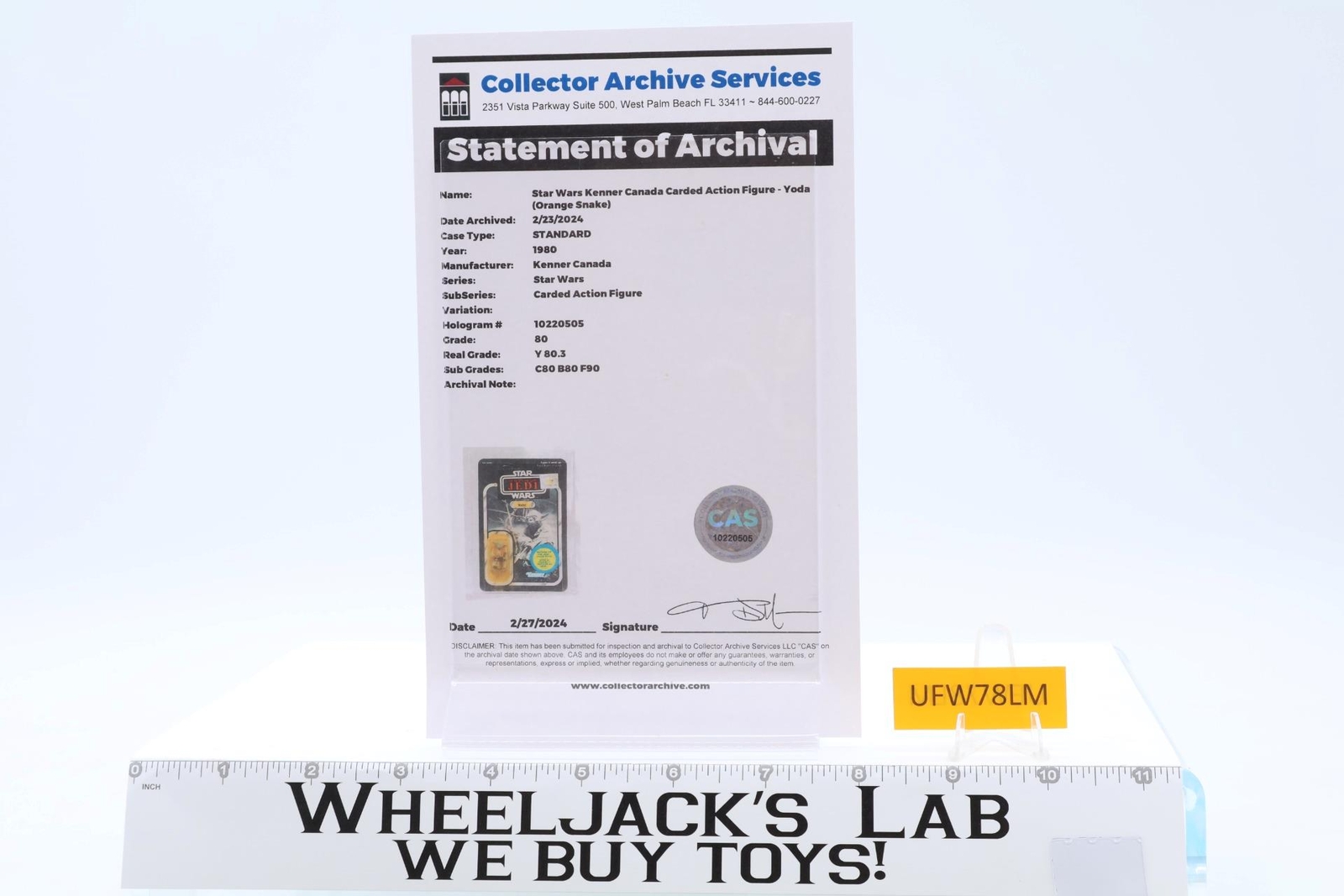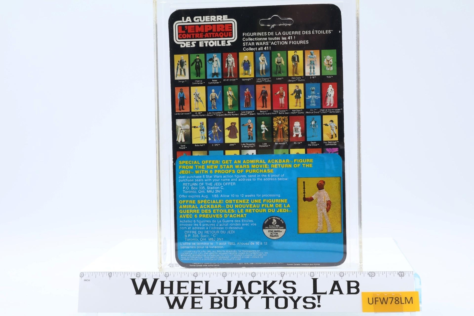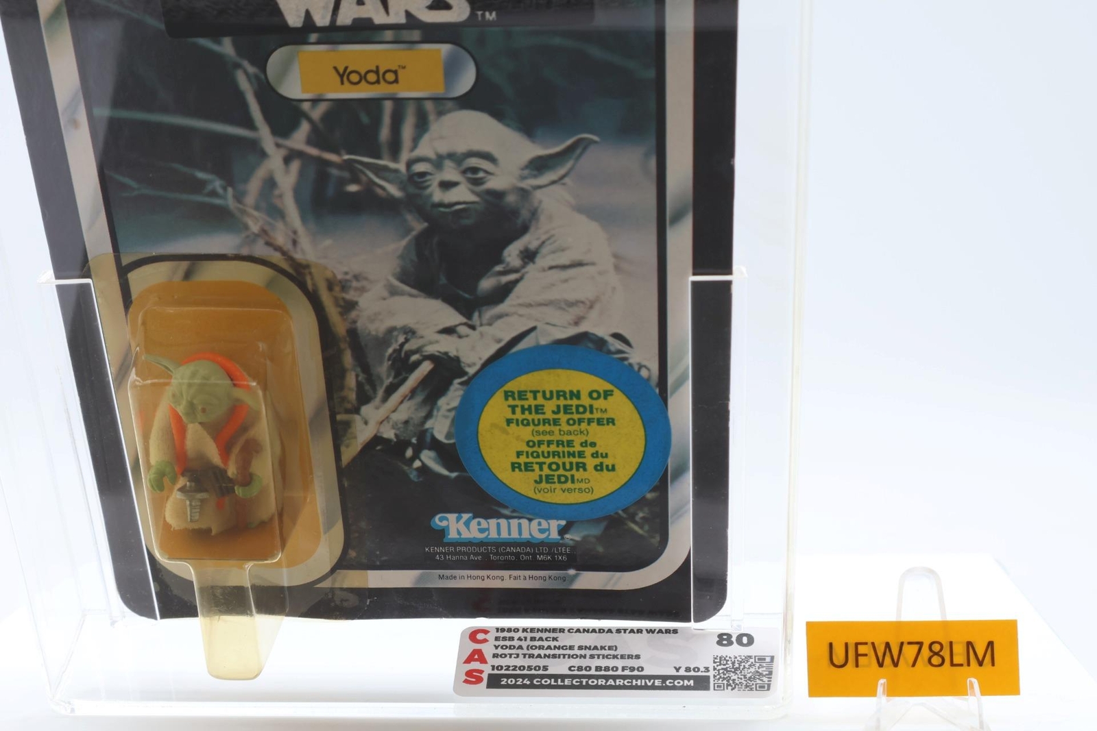 Are you selling your toy collection? Message us for a quote. Condition: Star Wars Canadian 41-Back ESB with ROTJ Transition Sticker Rated a CAS 80: card 80, blister 80, and figure 90 with the serial number shown. Pickups can be arranged. This item will be fully insured, professionally packed, and double-boxed. This item is professionally independently graded.