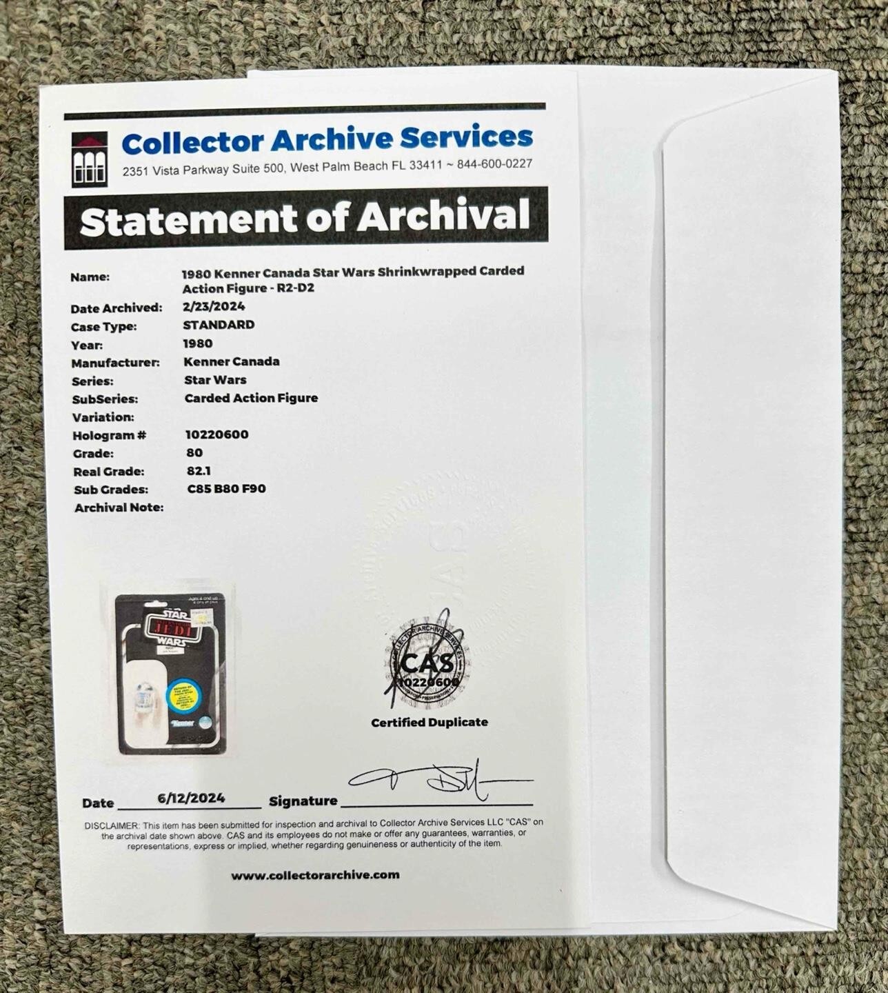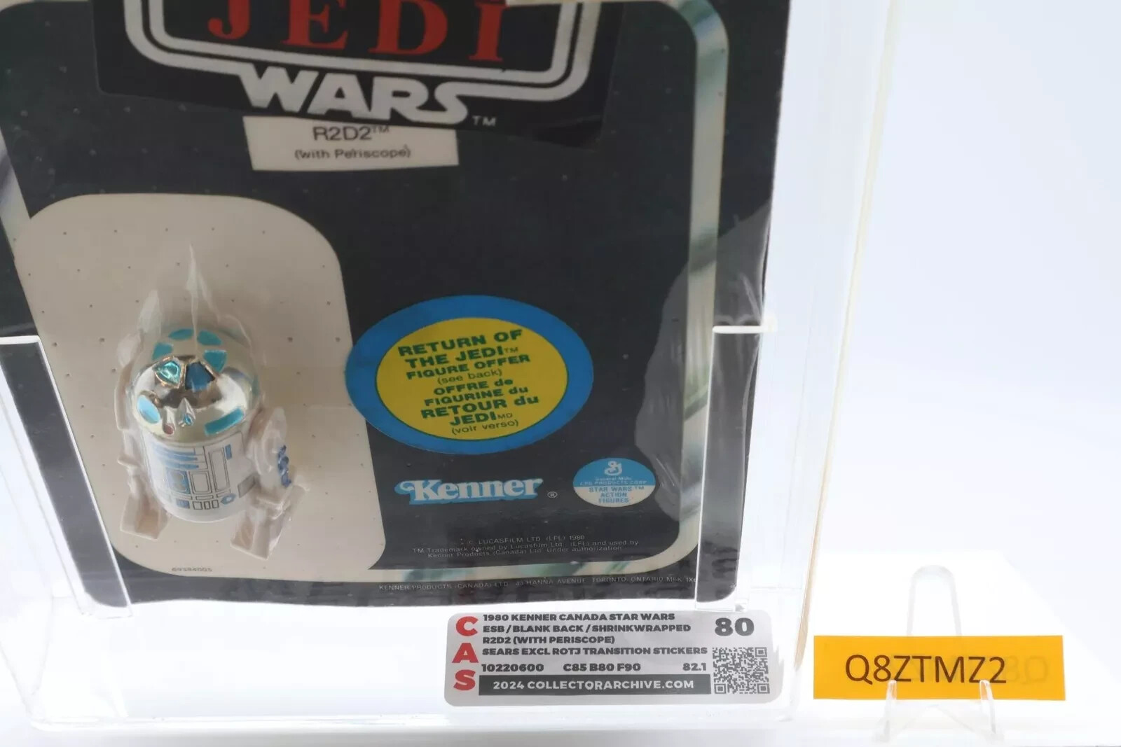 Are you selling your toy collection? Message us for a quote. Condition: Star Wars Canadian ESB Blank-Back Shrink Wrapped Sears Exclusive R2-D2 (w/ Periscope) with ROTJ Transition Stickers Rated a CAS 80: card 85, blister 80, and figure 90 with the serial number shown. Pickups can be arranged. This item will be fully insured, professionally packed, and double-boxed. This item is professionally independently graded.