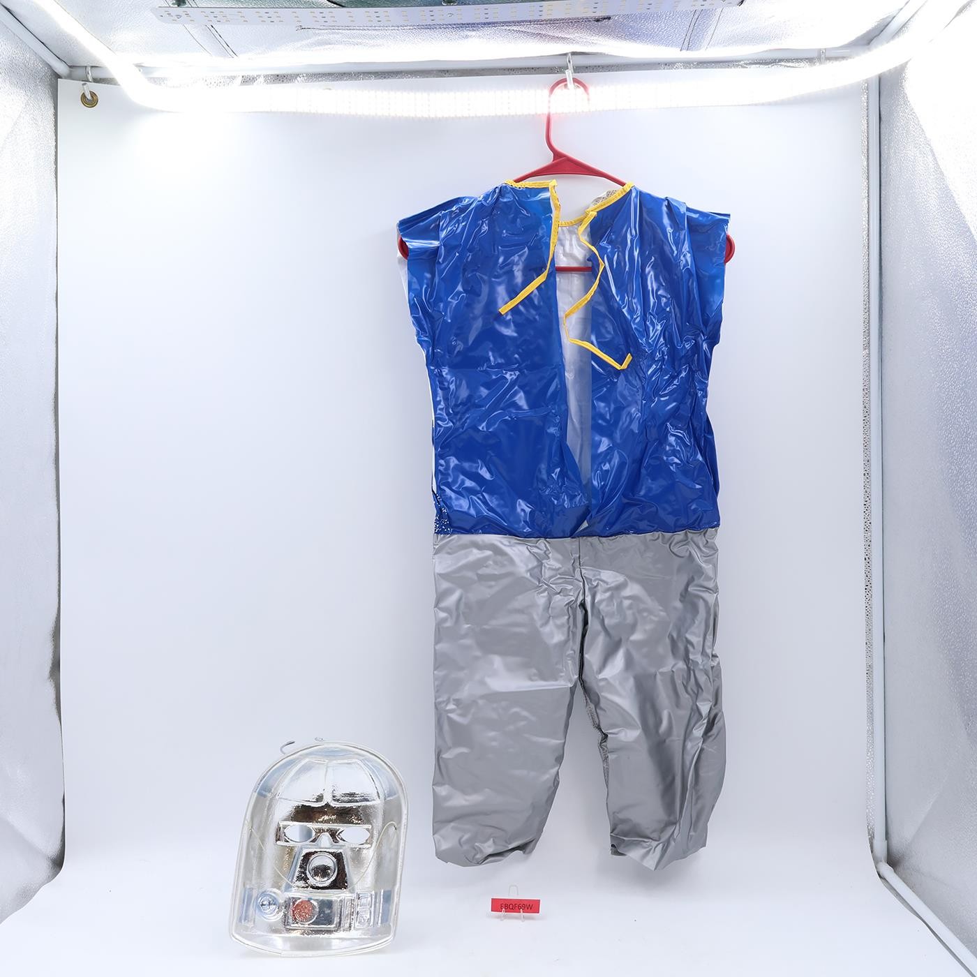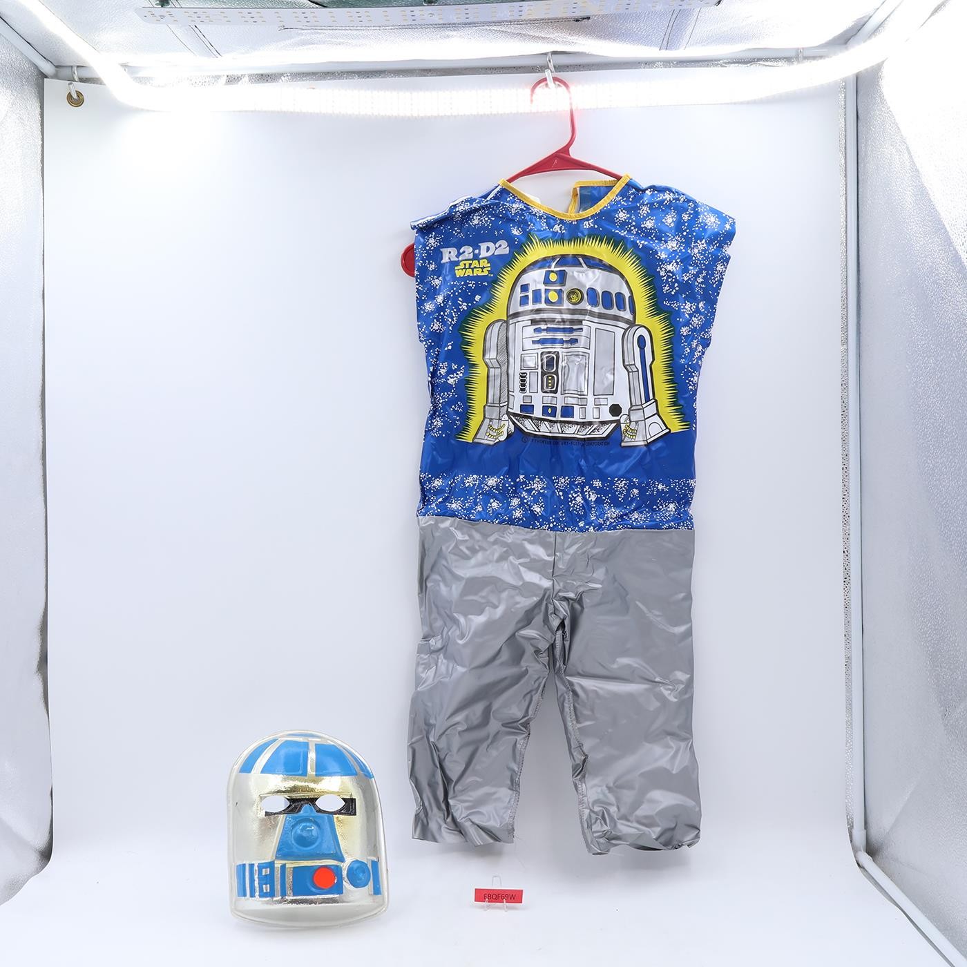 Costume Condition: This listing is for a R2D2 Vinyl Costume and Mask. Child size Small (4-6). Costume has some adhesive residue from tape inside costume. Costume appears to be free of rips or stains. Fastening string around the neck is intact. All seams are intact.
