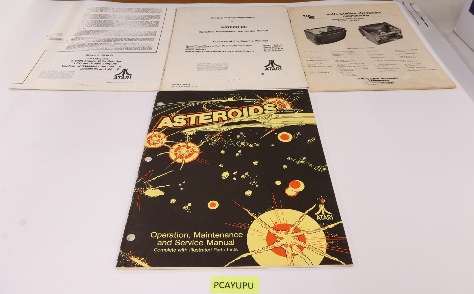 Condition: Operation, Maintenance and Service Manual, 6th Printing, 1979 by Atari, Inc. Staples intact but have rusted. Cover has started to separate from bottom staple (still holding see photo). Three-hole punched. Spine has scuffing. Book pages have some yellowing. Back cover has stain in upper left corner. Includes 3 supplements: Drawing Package Supplement (2 sided 33"x22" some stains), another supplement with Switch Inputs, Coin Counter, LED and Audio Outputs (33"x22" some stains) and thirdly, a manual for Wells-Gardner Electronics Corporation Graphic Display Unit Service Manual & Parts Catalog (back page has discoloration--see last photo). Comes as shown.