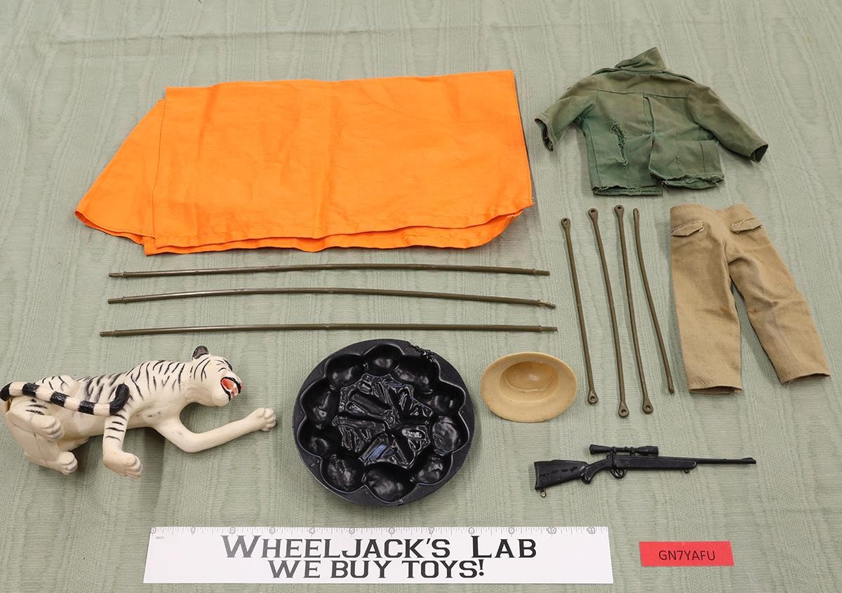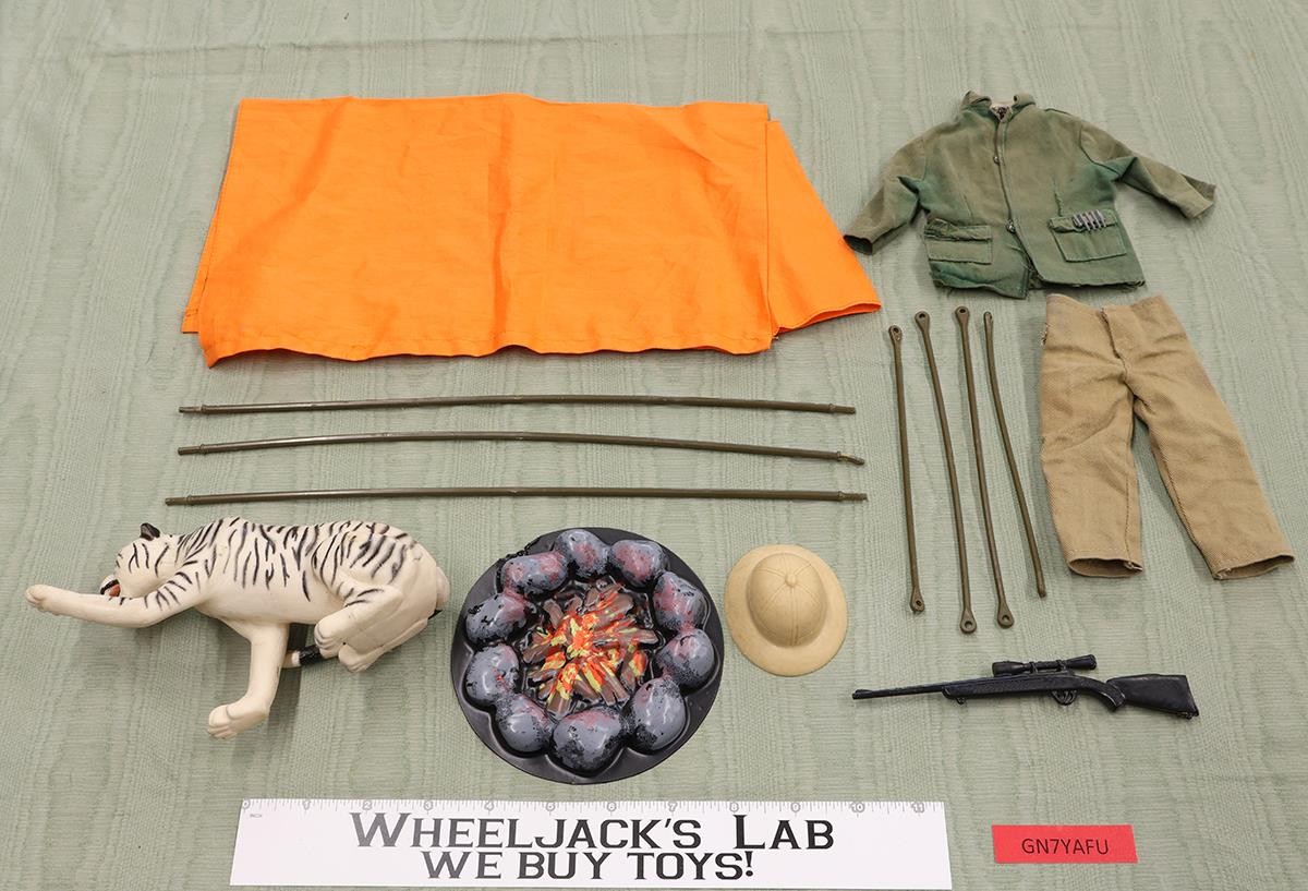 Accessory Condition: The items show some wear. The jacket is faded with a tear on the back. All the snaps are intact on both the jacket and pants. The fire ring has a melted spot on the edge. The gun is all black, instead of brown. Only 2 tent poles are missing. Not included are the tiger's cage with door. Comes as shown.
