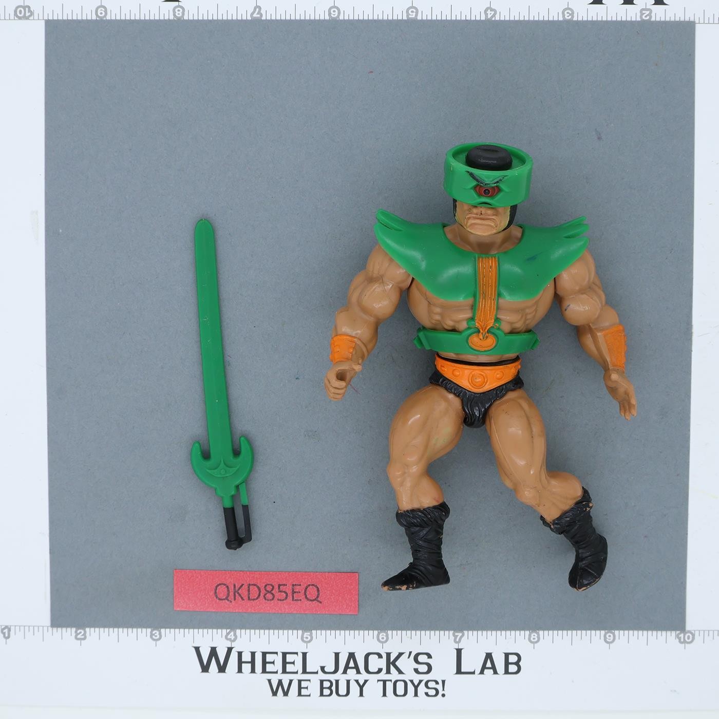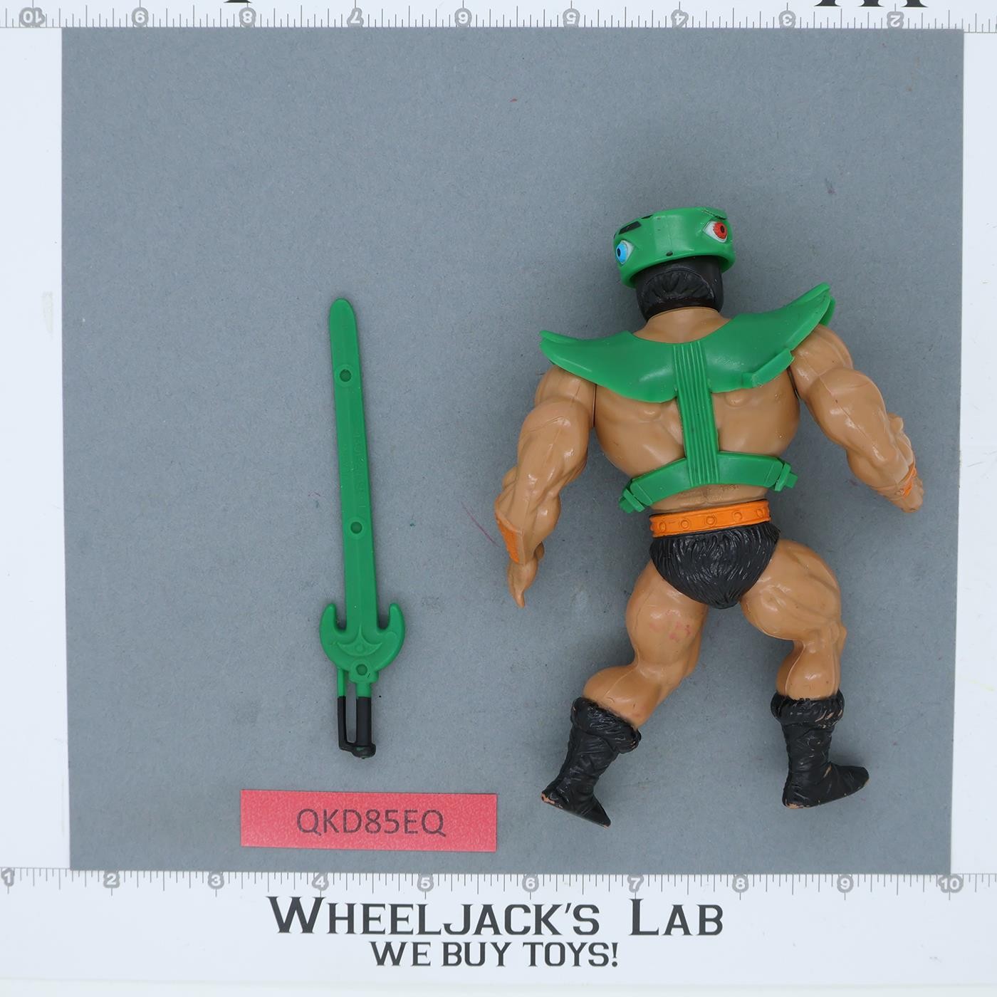 Condition: Rate 88 with light wear. The mechanism works. There is some wear on his boots and armor. Slight mark on the left side of the armor. He has a little extra yellow paint on his face. Our grading scale is 1 - 100, with mint flawless a 100, near mint a 95, excellent a 90, and so on. It comes as shown.