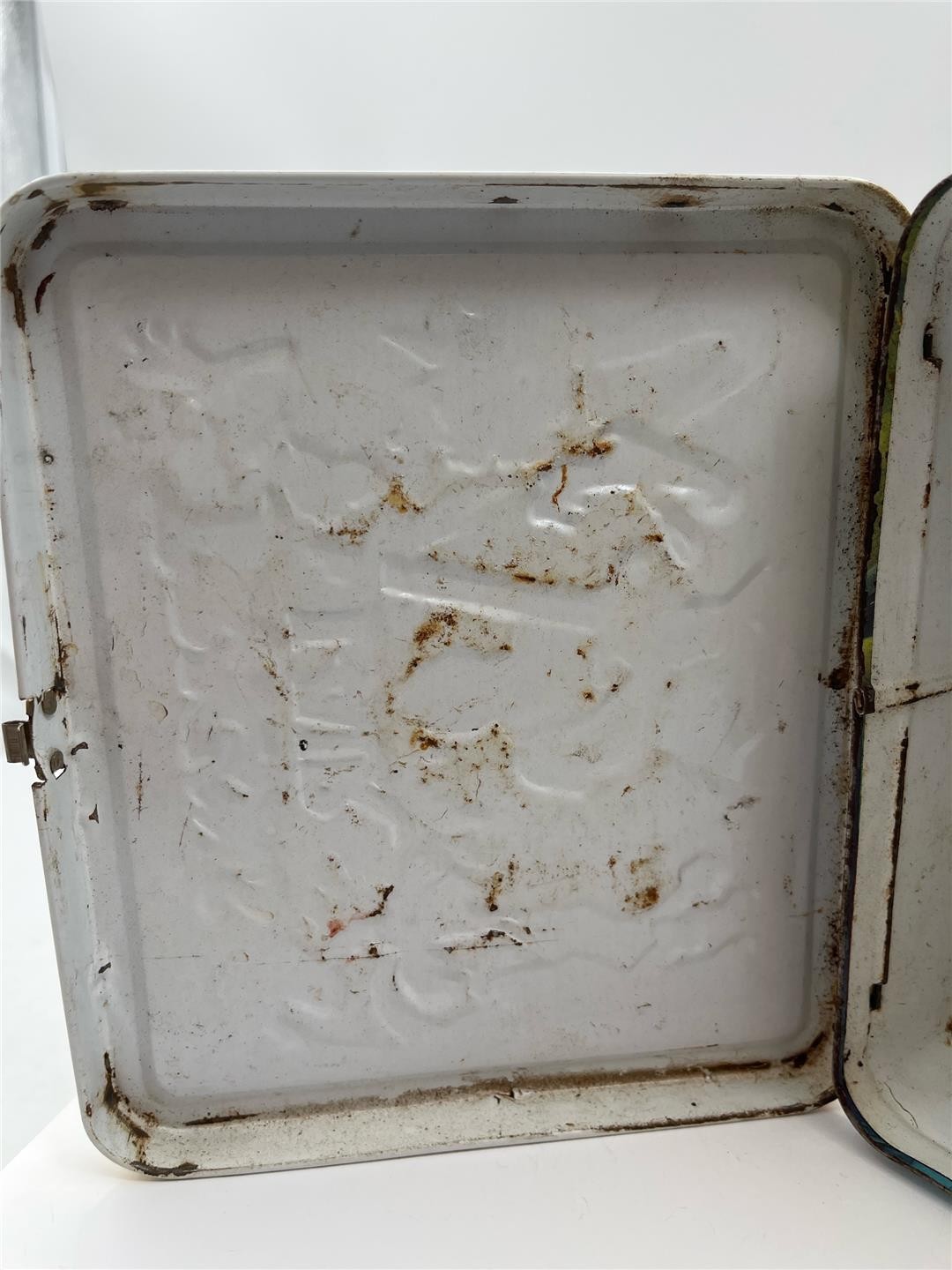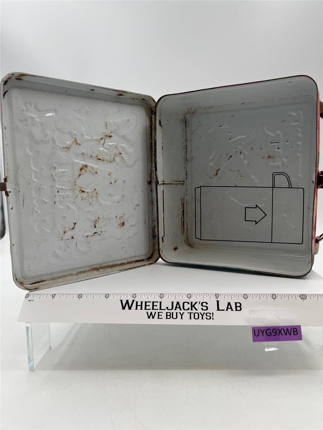 Condition: The lunchbox is made of metal and has some wear with scuffing and denting on both front and back sides. Some rust has formed on both exterior and interior of lunch box. Graphics are nice and bright. Latch and handle are intact and working. Latch has some rusting. Does not include thermos. Needs light cleaning. Comes as shown.