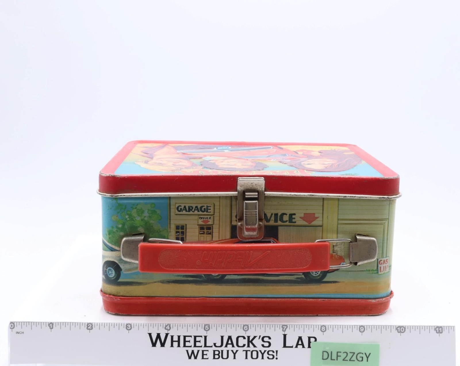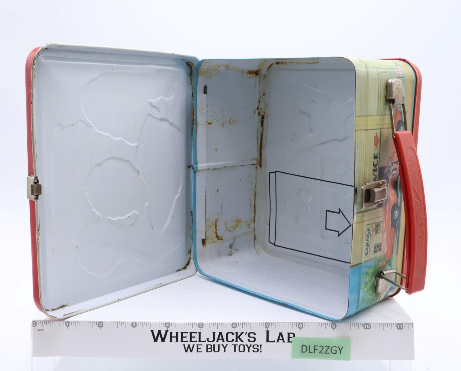 Condition: The lunchbox is made of metal. It has some wear and needs cleaning. There is rust on the outside and the inside. The handle and latch are intact, but are rusted on the metal portions. Scuffing along the edges; dents on front and back sides. Some of the adhesive residue was cleaned off after taking first photo. Comes as shown.