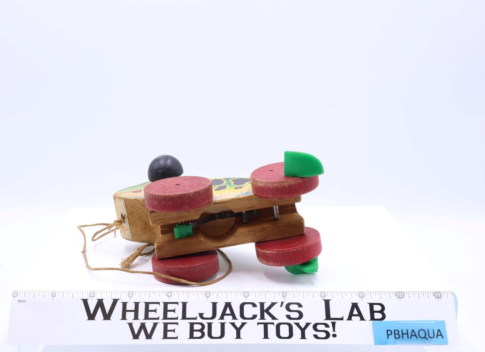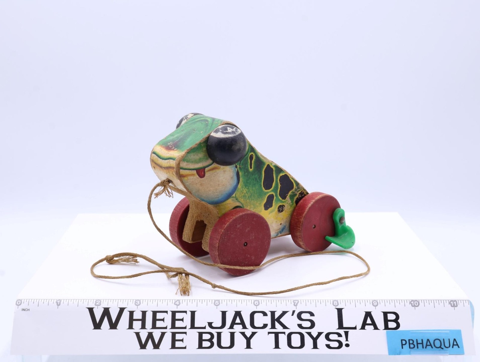 Condition: The item has heavy wear with soiling, fading, and a missing piece in the paper coverings on its neck. Wheels turn and the frog still croaks. Comes as shown.