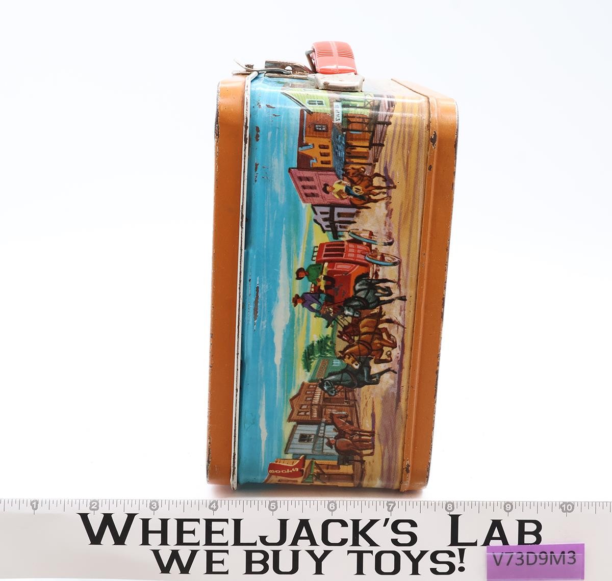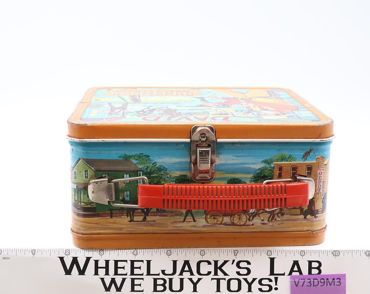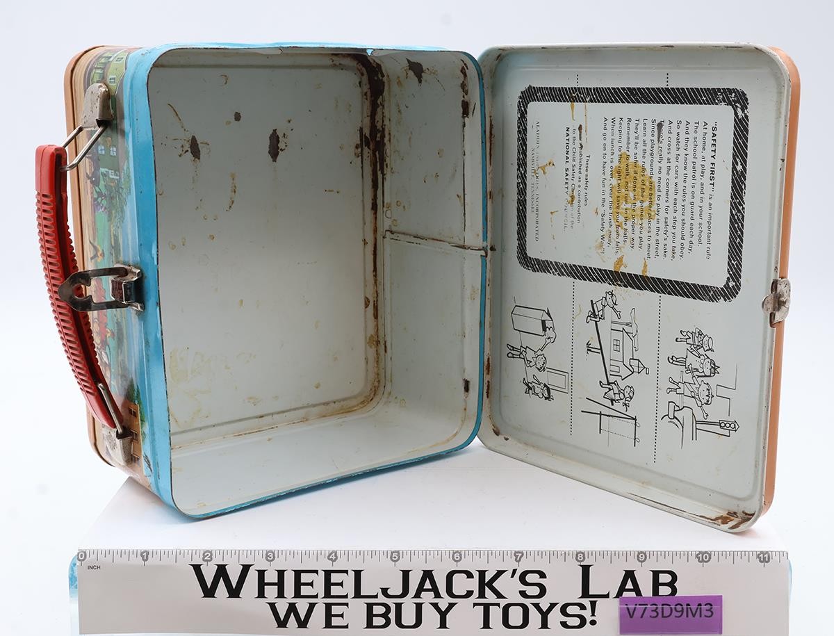 Condition: The lunchbox is made of metal and has some wear with scuffing. Exterior has light rusting along the bottom edge of lunch box. Interior has some rusting in bottom corner. The handle is intact but needs cleaning. Metal portions of handle have light rust. The latch is intact and working; has light rust. name written in pen and marker on front side. Thermos is not included. Comes as shown.