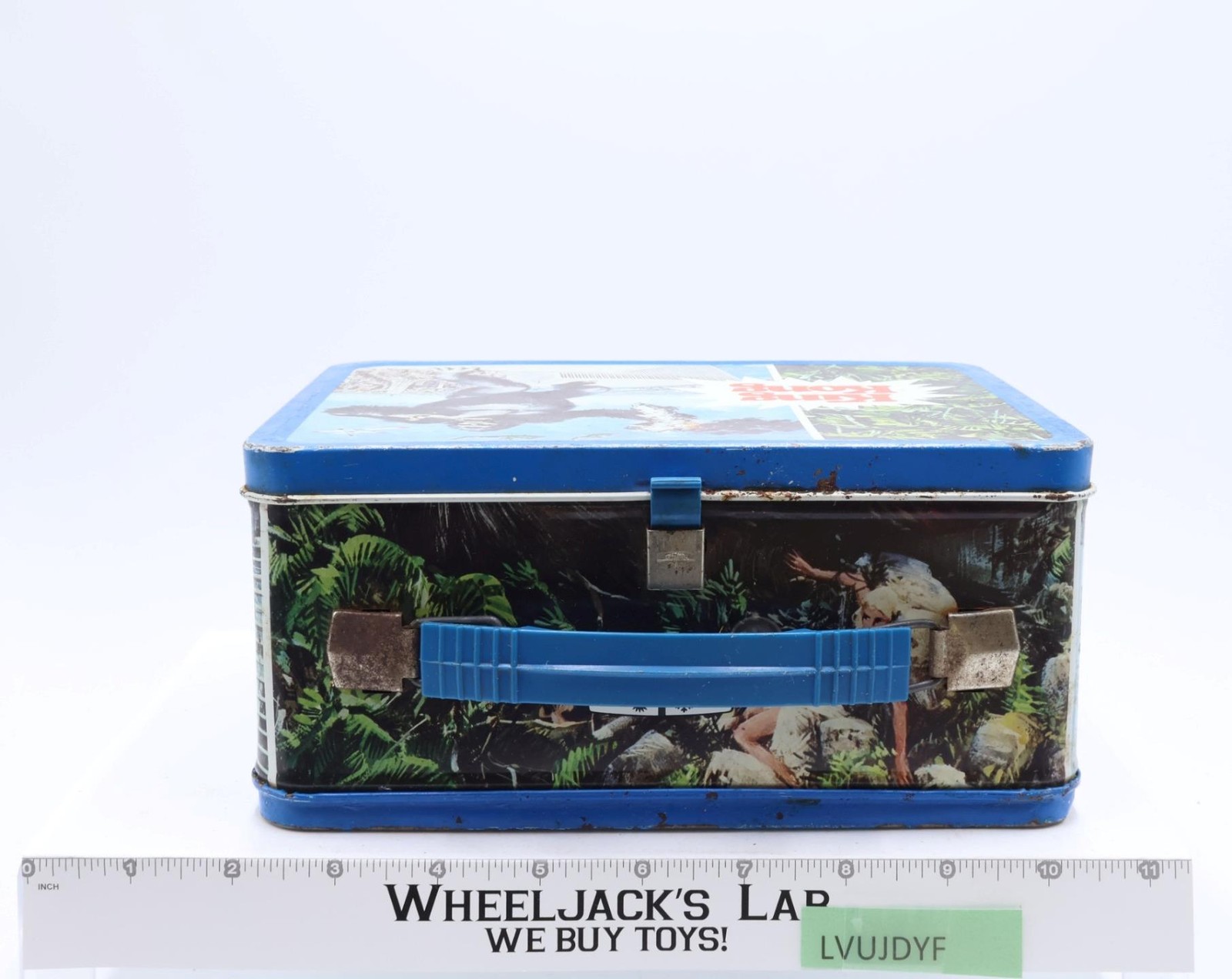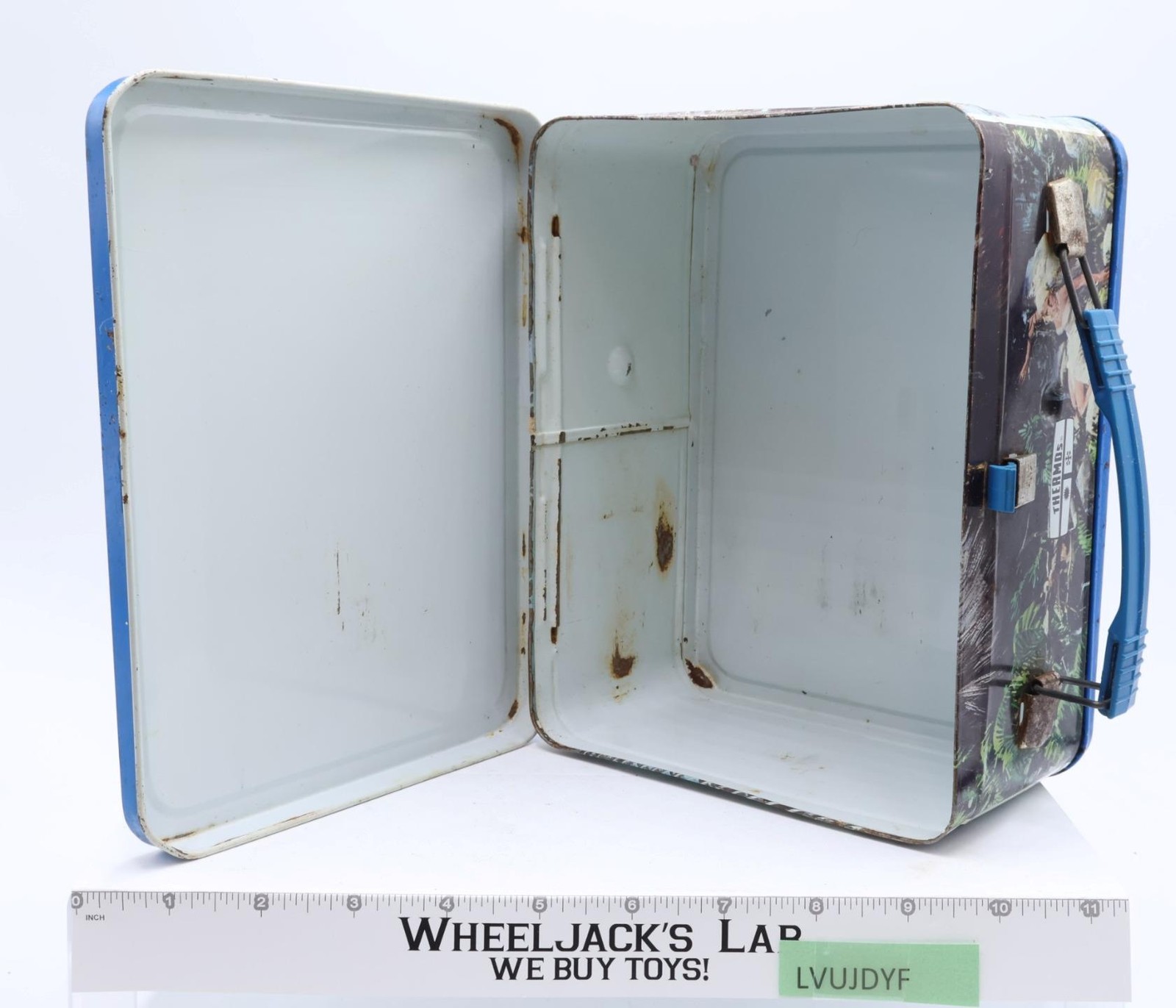 Condition: The lunchbox is made of metal. It has some wear with scuffs and scratches mainly on edges. Lunchbox needs cleaning. There is rust on both the inside and outside of the box. The latch and handle work but are rusted on the metal portions. Does NOT include the thermos. Comes as shown.