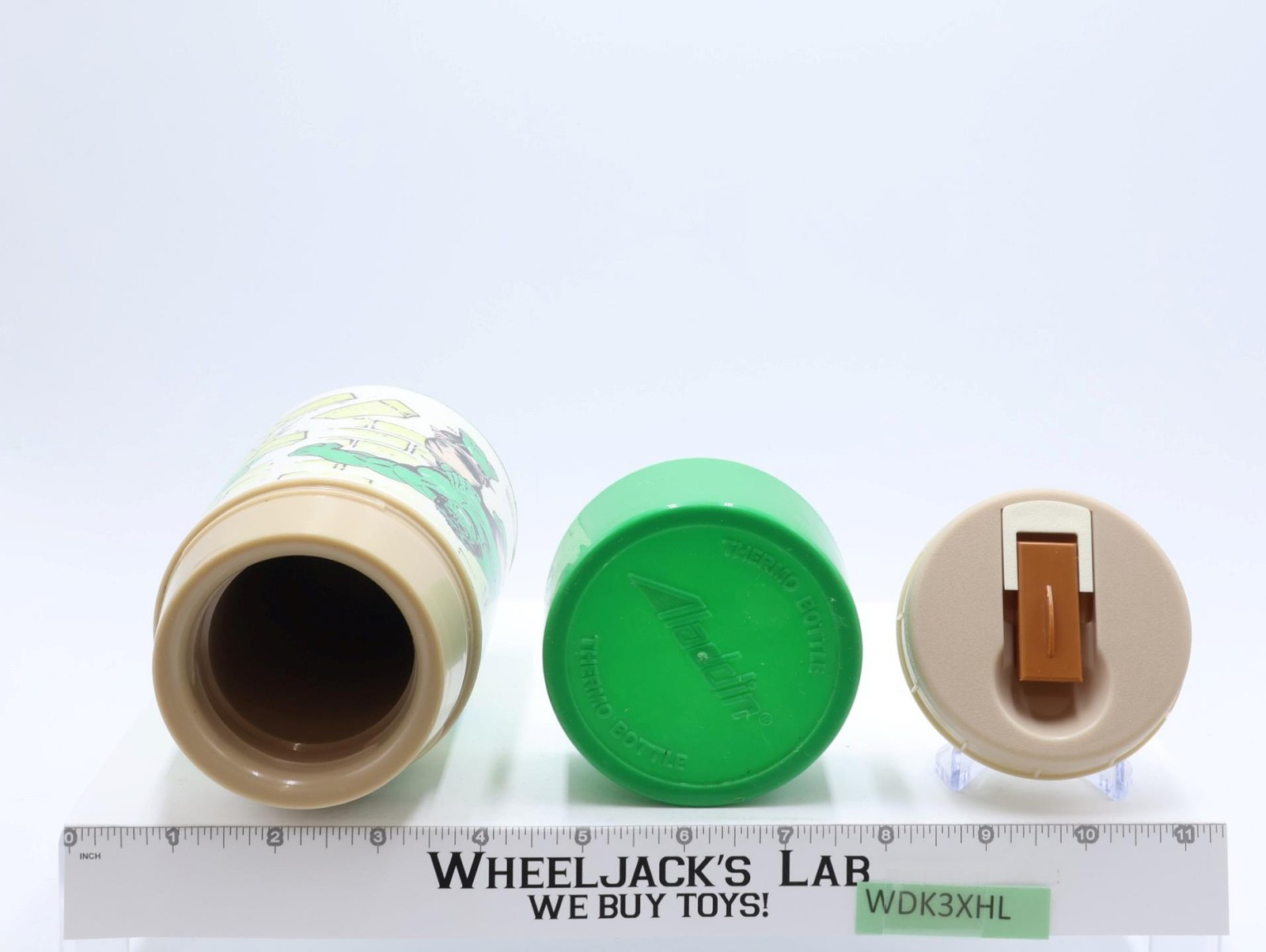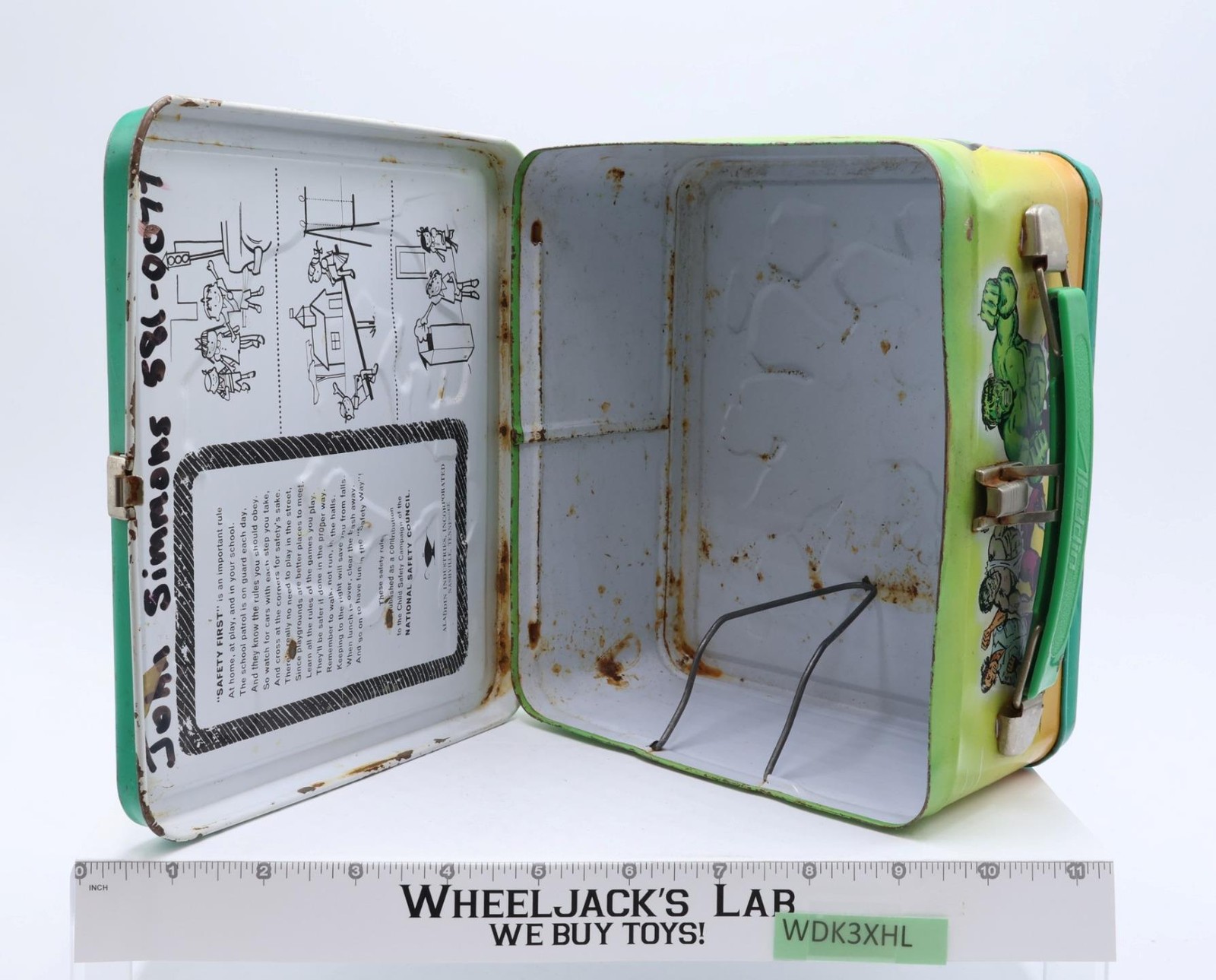 Figure Condition: The item is made of metal. It has rust on the inside and outside. The latch and handle work but are rusted on the metal portions of latch. Name written on front; dent on adjacent corner to where name is written. Name and phone number written inside the box. Tape residue inside lunchbox. The lunchbox is 1978 model and the thermos is a 1980 model. The thermos has both the inner (flip-top) and outer lids. Outer cap/cup is missing the handle and there is a crack along bottom of thermos (inner lining of thermos is intact). The arm that holds the thermos in place is intact. Lunchbox needs cleaning. Comes as shown.