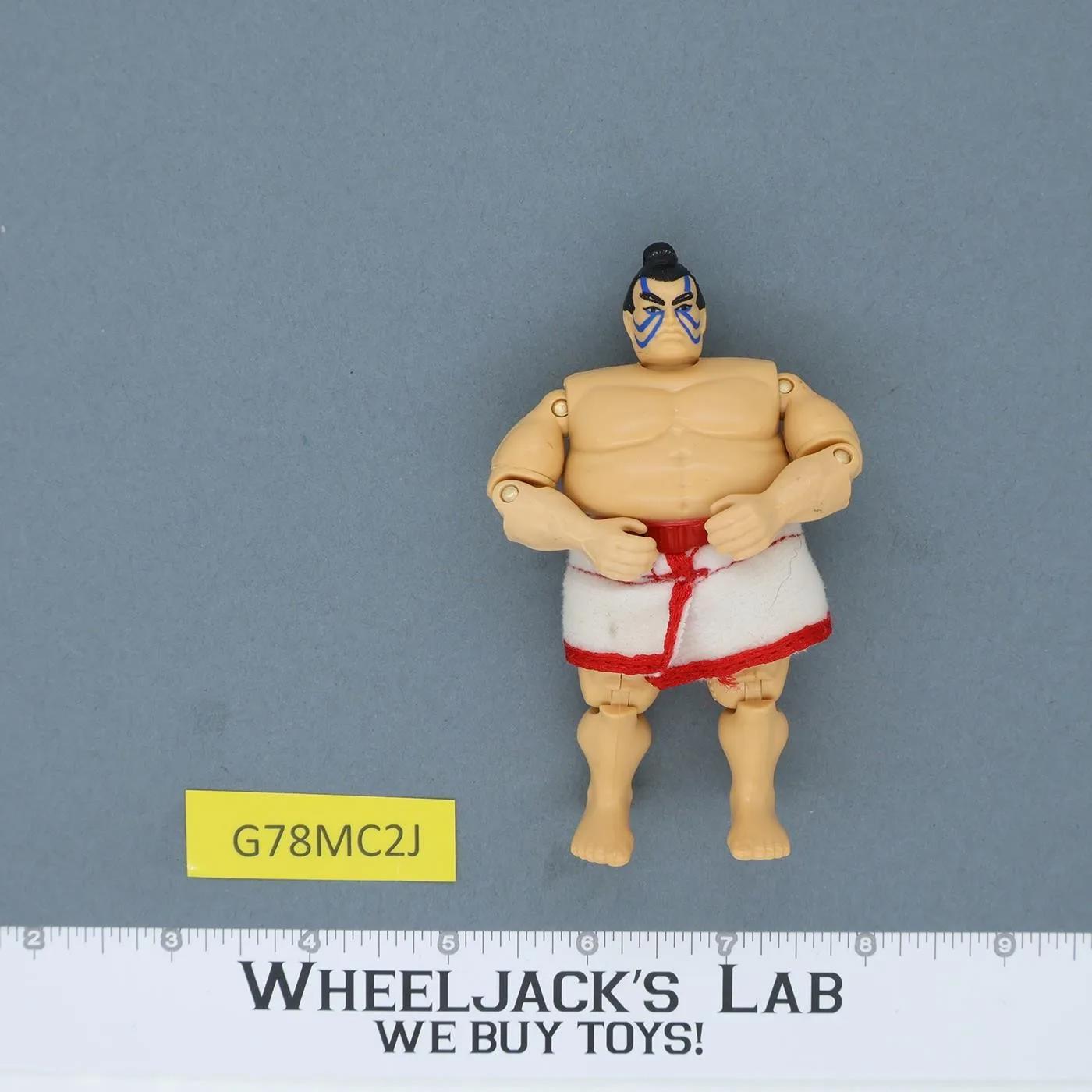 Condition: Rated 85 with light wear. No elbow cracks. Figure needs light cleaning. Could not get left leg straight to stand. Our grading scale is 1 - 100 with mint flawless a 100, near mint a 95, excellent a 90, and so on. Comes as shown. Accessories: Includes white with red trim mawashi (skirt). Joint Condition: Left leg will not stay down due to the action; Right leg is semi-tight. Other joints are tight.