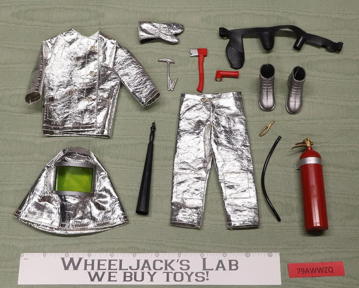 Item Condition: The outfit is complete except for one missing protective glove. The shield in the helmet is intact. The clothing has little wear. The belt has both parts to the buckle. The pliers is missing a small piece. The clamp to the extinguisher is broken on one side. Both boots are split along the seam. Comes as shown.