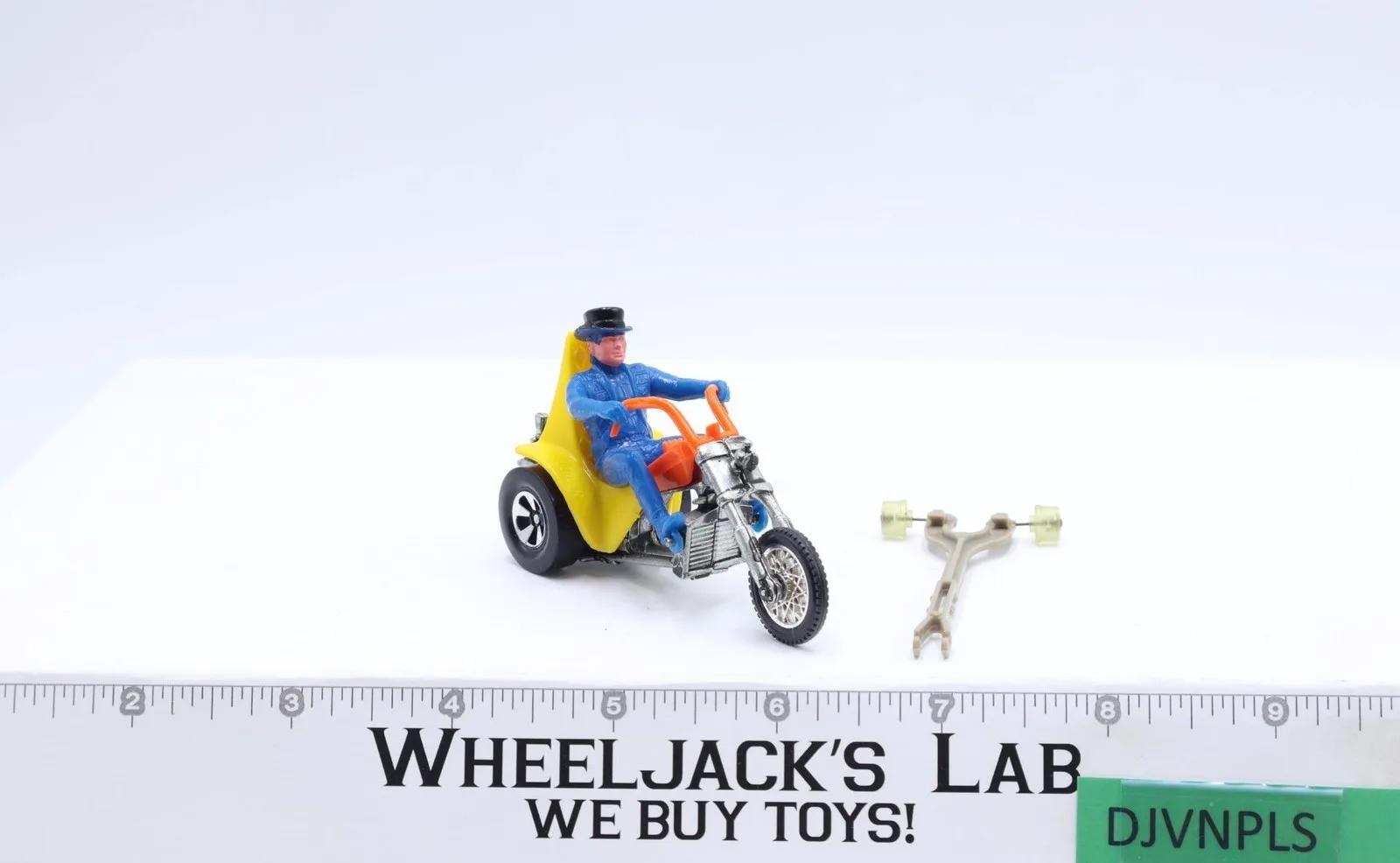 Vehicle Condition: Rated 80 with some wear. Cycle needs cleaning. Chrome accents show some wear. Our grading scale is 1 - 100 with mint flawless a 100, near mint a 95, excellent a 90, and so on. Chrome engine is medium brightness. Tires and front tire chrome has light wear. Tire chrome on back tires has heavy wear. Comes as shown. Rider Condition: Comes with rider, "Tops" with blue outfit and black hat. Rider is rated 80 with some wear and fading. Rider's loops on hand and feet are all intact with no cracks. Rider has peach spot on back of left thigh. Figure needs cleaning.
