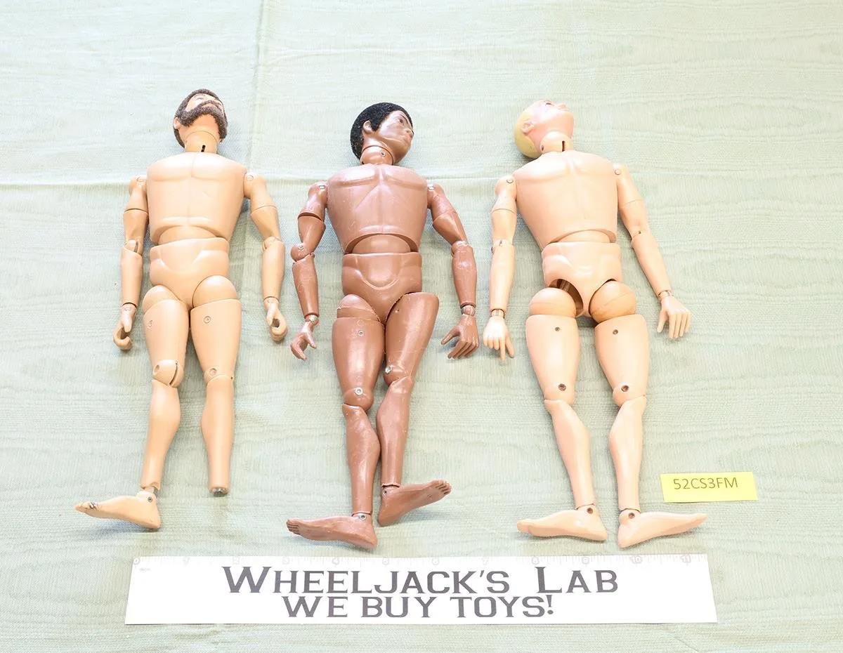 Condition: Three figures for parts or restoration. Black Adventurer is missing a left hip joint and has a cracked left knee. Flocked hair is mostly intact, but needs cleaning. Land Adventurer has a head that appears to be authentic GI Joe, but the body says Cotswold China and is missing a left foot. Flocked hair and beard are intact. Blonde GI Joe Action Pilot has a loose body string. The left knee is cracked. Comes as shown.