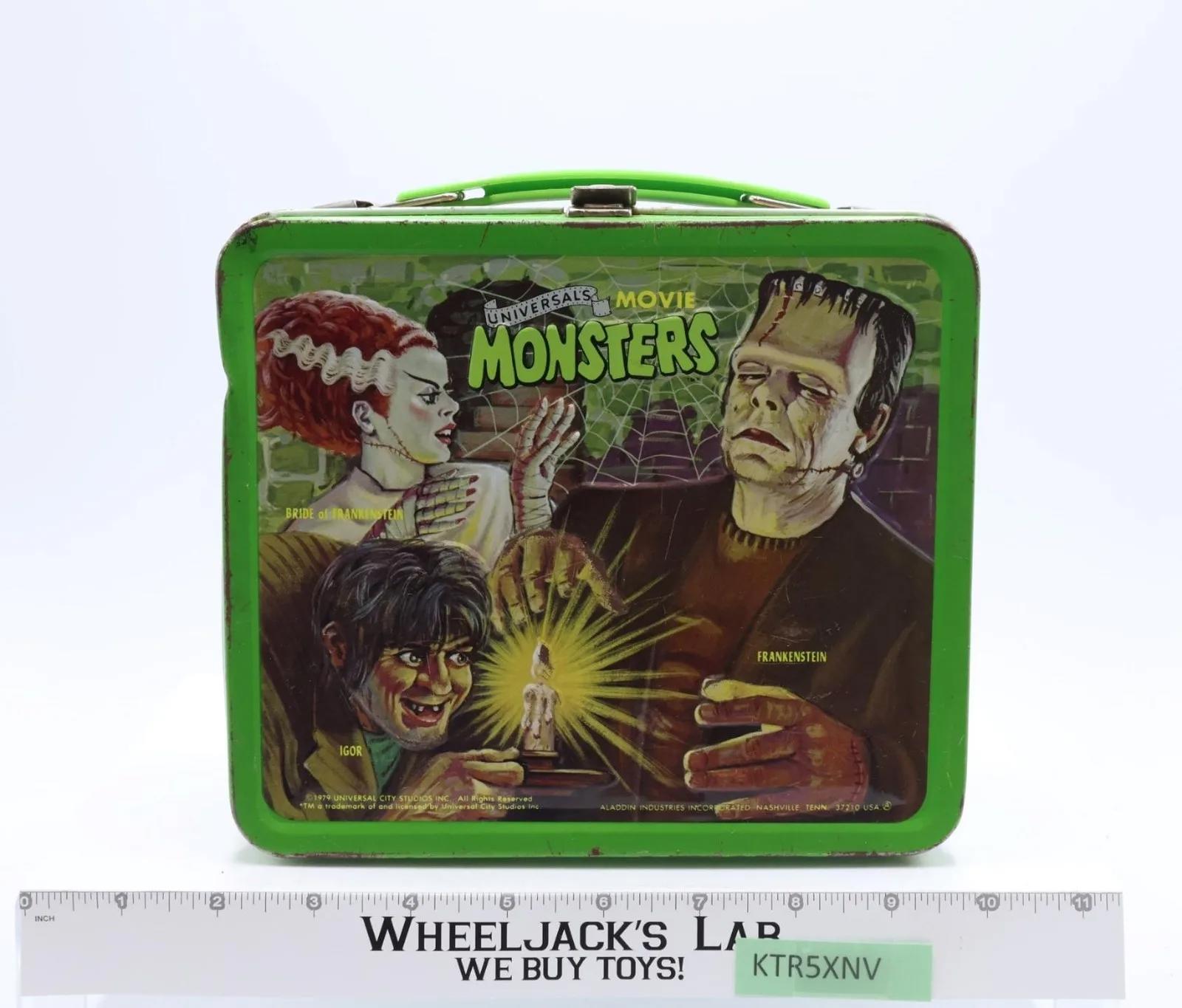 Condition: The lunchbox is made of metal and has wear with scuffs and scratches. Lunchbox has rust on the inside and outside. There is a larger dent on the left side of the front and several smaller dents on corners and sides. The latch and handle are intact. Does NOT include thermos. Needs cleaning. Monsters featured include: Count Dracula, Wolfman, Frankenstein, Bride of Frankenstein, Igor, Mole Man, Tarantula, Mummy, Creature from the Black Lagoon, Mutant, and Phantom of the Opera. Comes as shown.