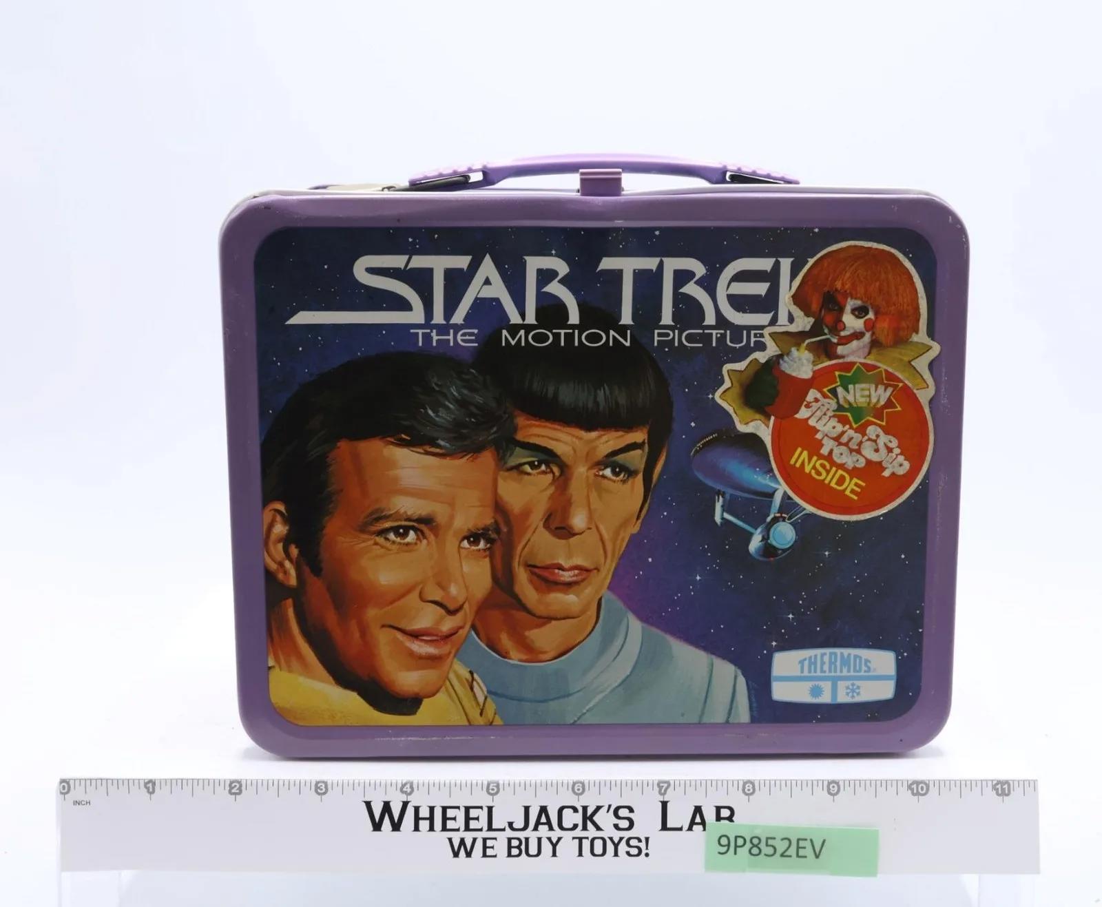 Condition: The lunchbox is made of metal and has light wear with minimal scratches. Lid has a dent near where it latches. Has light scuffing along outer edges. Latch and handle are intact with minimal rusting. Interior is very nice with only a tiny bit of rust in the lid and on the hinge pin. Lunchbox has original sticker advertising Flip 'n' Sip Top Thermos and the original paper for the Flip 'n' Sip Top thermos. Lunchbox does NOT include Thermos. The image on lunchbox front features Captain Kirk and Spock. Back panel has "Star Trek The Motion Picture" along with Dr. McCoy, Captain Kirk, and Spock. Comes as shown.