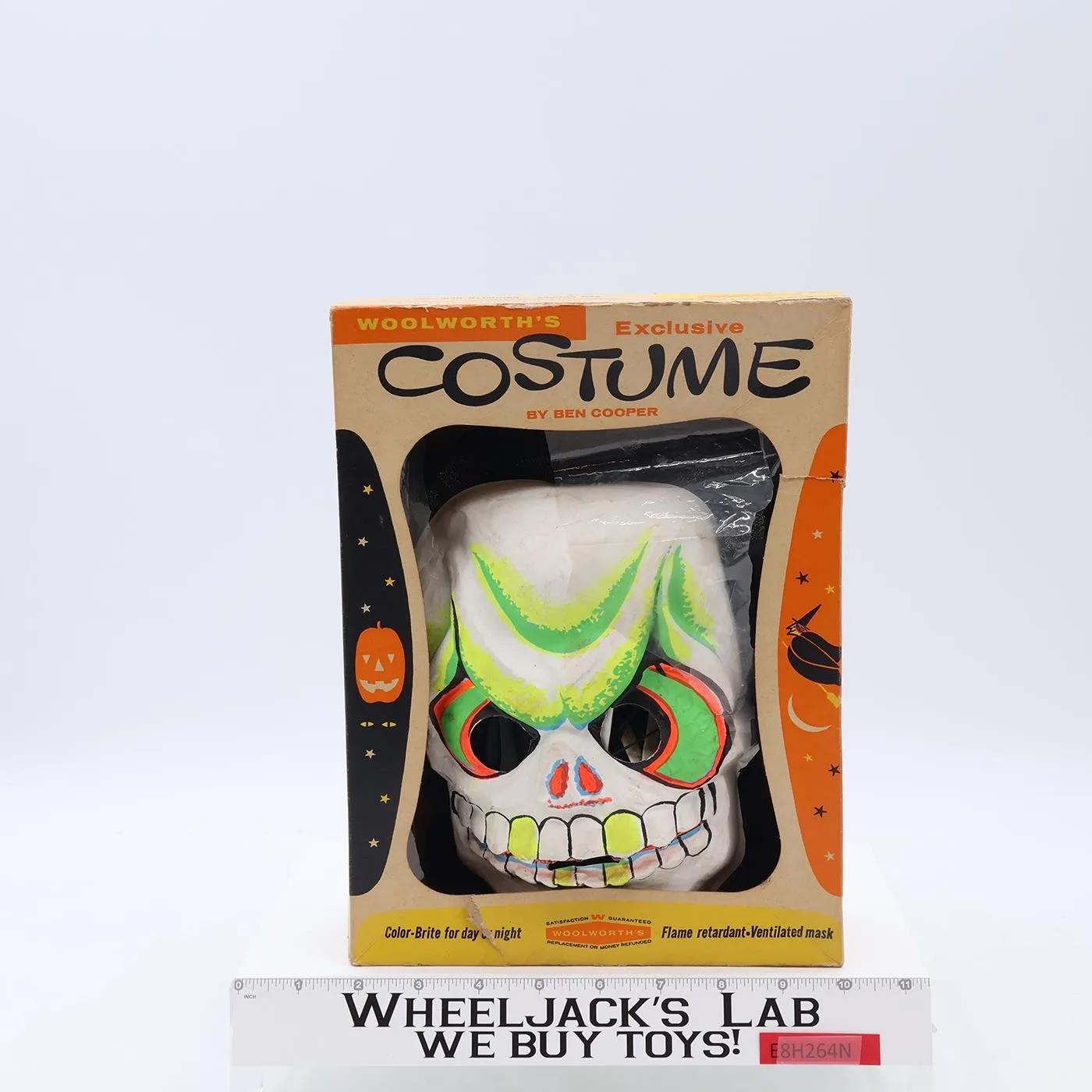 Costume Condition: This listing is for a Skeleton costume by Ben Cooper exclusively for Woolworth's. Child size Medium (8-10). Costume shows moderate wear. The skeleton graphics on coverall has faded. Tie at neck is intact. Seams around crotch have been stressed and possibly mended. Fabric is very wrinkled; multiple snags and small holes. Fabric is rayon. Mask Condition: Mask has some wear with cracks along edges of mask and cracks where string attaches to mask. One side of string has its original fastener; other side of string has been tied in place. Mask has soiling on front and backside; needs cleaning. Mask has some dents. Name is written inside the mask. Box Condition: Box has moderate wear with some tears along edges and where string attaches to and discoloration. Plastic window has ripped open; some remnants of plastic window are still attached to box lid. Box bottom has stains inside bottom. Comes as shown.