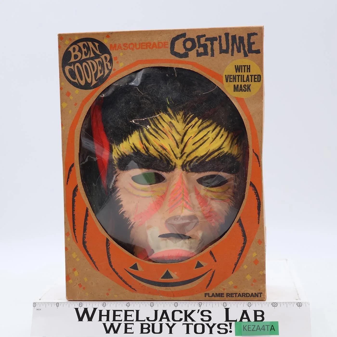 Costume Condition: This listing is for a Wolfman costume by Ben Cooper. Child size Medium (8-10) Fabric is rayon and has heavy wear on bottom; some wear on torso. Crotch and seat (extending up the back and down inner leg seams) are completely ripped out. Binding at neck is intact but fraying. Some fabric discoloration and some snags. Graphics on costume are in very good condition and could be nicely displayed from the waist up. Comes as shown. Mask Condition: Mask has some wear with dents and some fading. Mask needs light cleaning. Original strap and staples to hold in place are intact. Cracks around mouth and a crack at side of face. Mouth has hole but there are no nose holes. Comes as shown.Box Condition: Box has moderate wear with some dents, creases, and scuffing. Plastic window is wrinkled from the mask contour. Two sides of the window are loose and there is a rip in window. Box bottom has some dents and warping. Name was written on outside of box bottom and crossed out. Comes as shown.