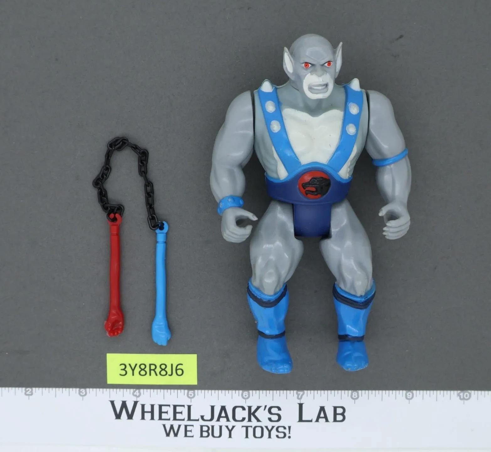 Figure Condition: Rated 90 with very light wear. Super nice Panthro in like-new condition! He has a great face, perfect paint with no wear around the mouth. Slightest wear on the tips of a few spikes on his back is hardly perceptible. His rear has a bit of shading, faint scratches, barely visible. There is a speck of wear on his left heel and two tiny dots of white on the bottom of his left foot. The arm mechanism works, but is a little weak on the left side. Our grading scale is 1 - 100, with mint flawless a 100, near mint a 95, excellent a 90, and so on. Comes as shown. Accessories: 100% complete.Joint Condition: Tight.
