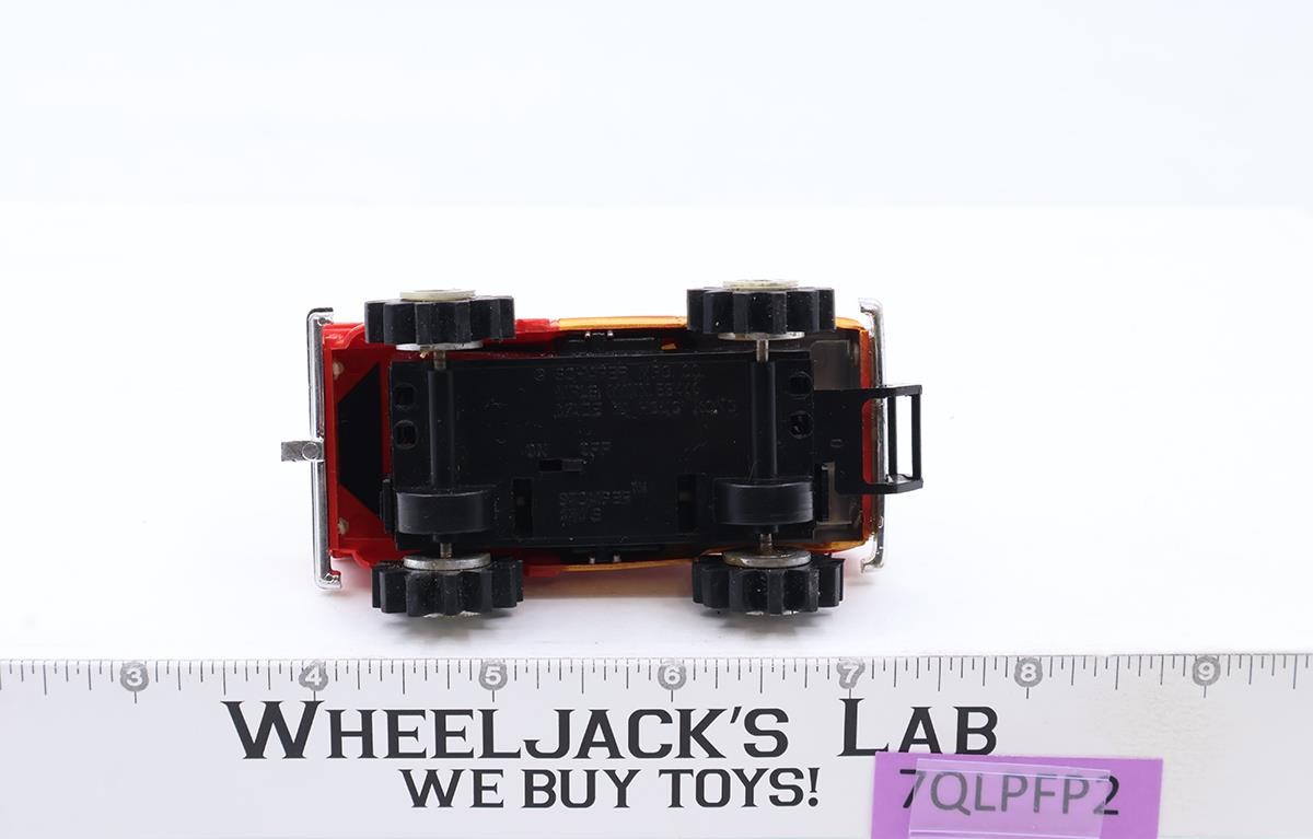 Paint- Light wear. Wagon rails intact and in good condition. Truck bed lights have minimal wear. Decals:Light wear; very good condition.Windshield(s)- Light wear; no cracks.Hood/Body - Removable and works. Clips on sides of base. Lightbulb - Tested and light is working. Base Plate- Legible. MFG Stamp- Hong Kong.TIRE Chrome- Has heavy wear; one wheel chrome has crack. Tires- Rubber; light wear. Working Condition- Tested and light and motor work. Motor runs inconsistently. Enlarge pictures for better detail and/or use the "zoom" function. Comes as shown.