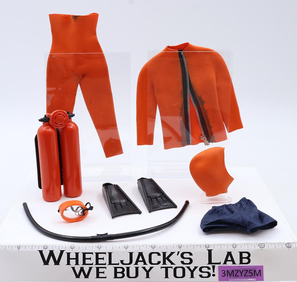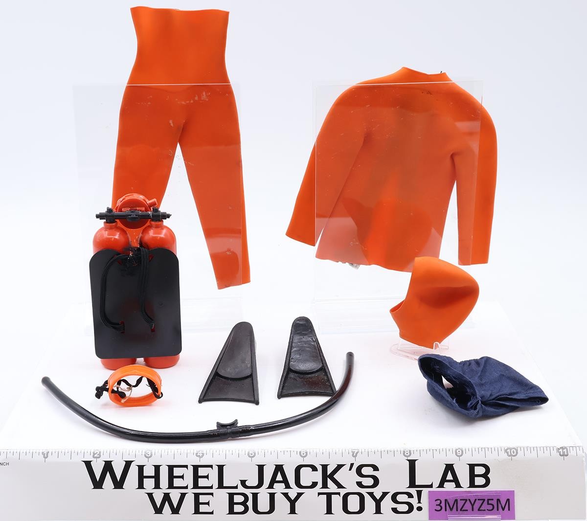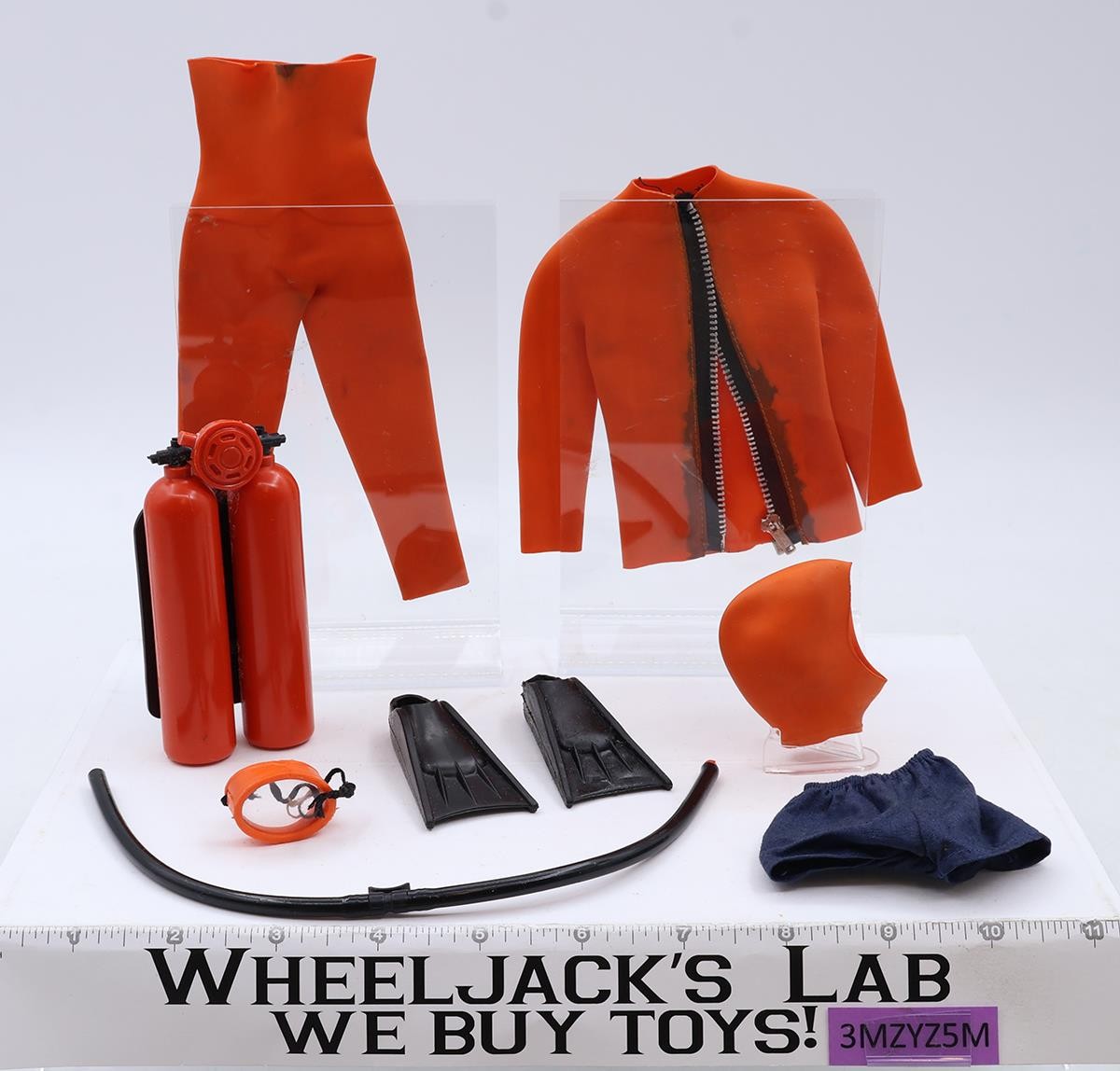 Accessory Condition: In good condition. The rare rubber suit is complete with all three pieces. There is some staining around the zipper area, which seems very delicate. One side of the hose is broken off from the regulator. This is a complete set. Comes as shown.
