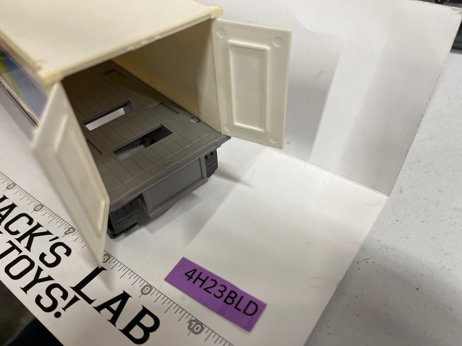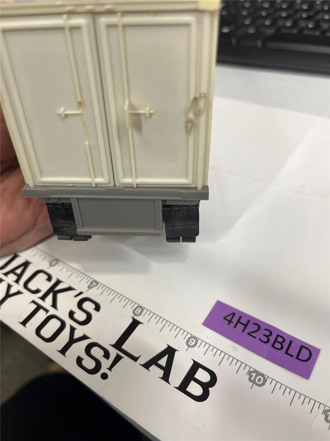 Trailer- Has some wear with fading; decals on sides have some foxing on edges. Trailer has melt marks along top edge and on back door. Mud flaps are intact.