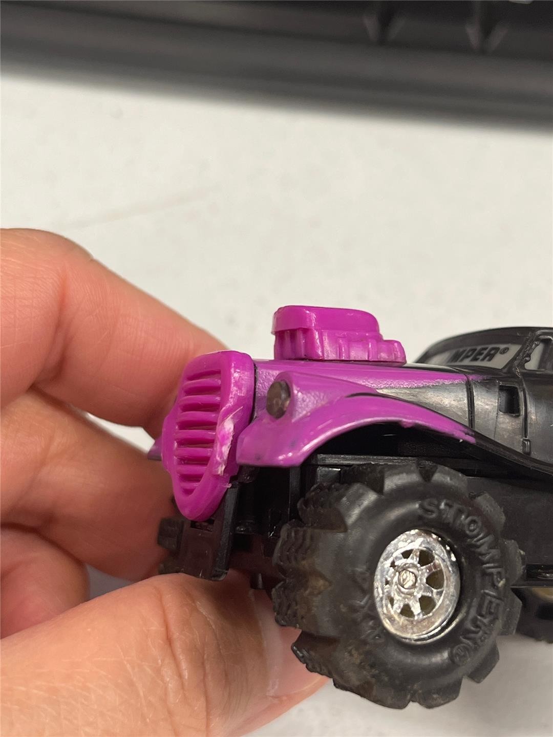 Note: Tow hook extending from back bumper has broken off. Missing side pipes on vehicle. Missing pieces that exend on either side of front grille (appears to have been intentially cut off).