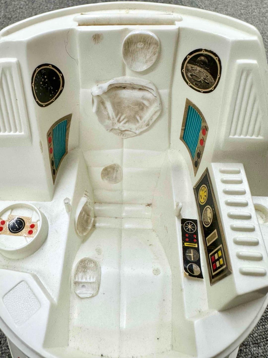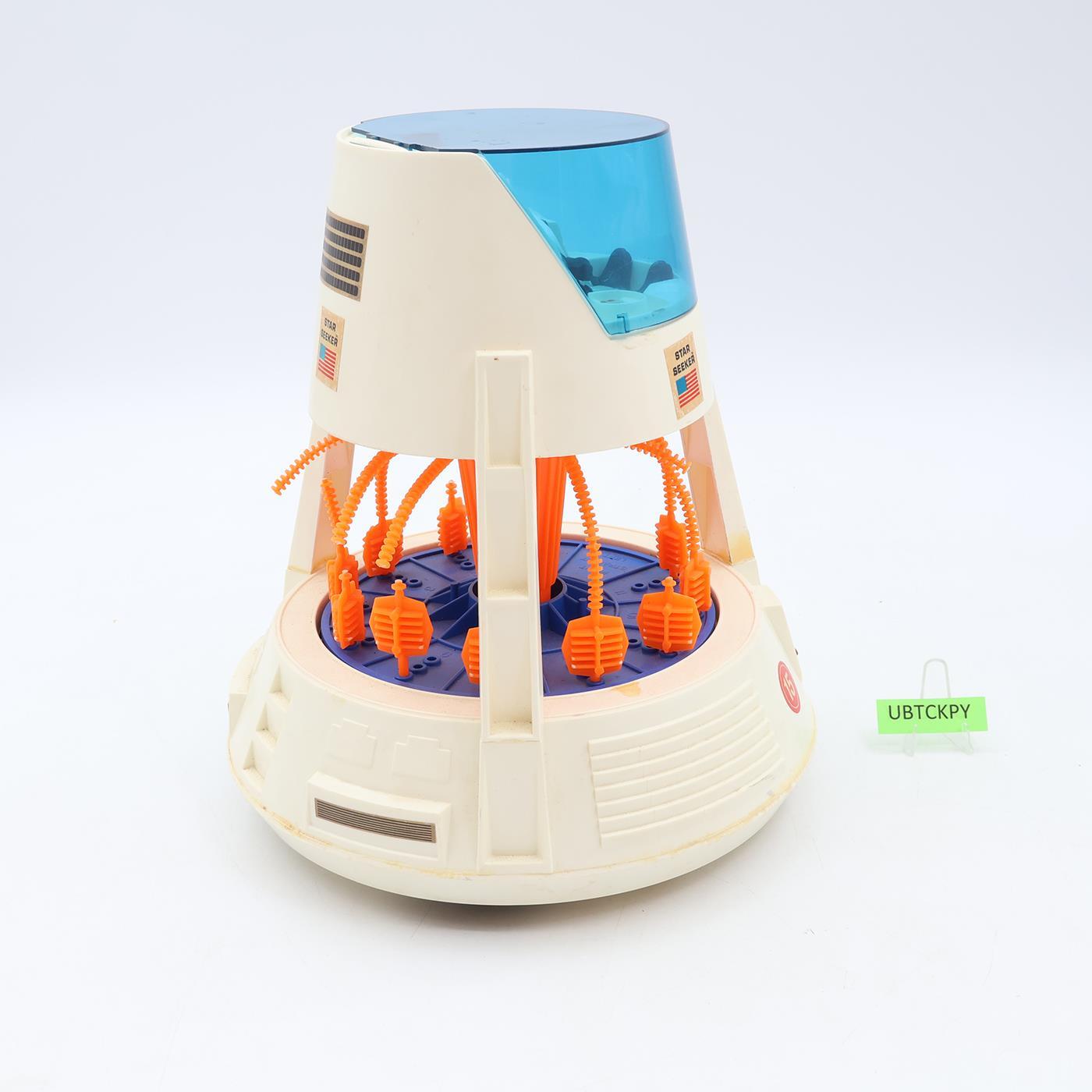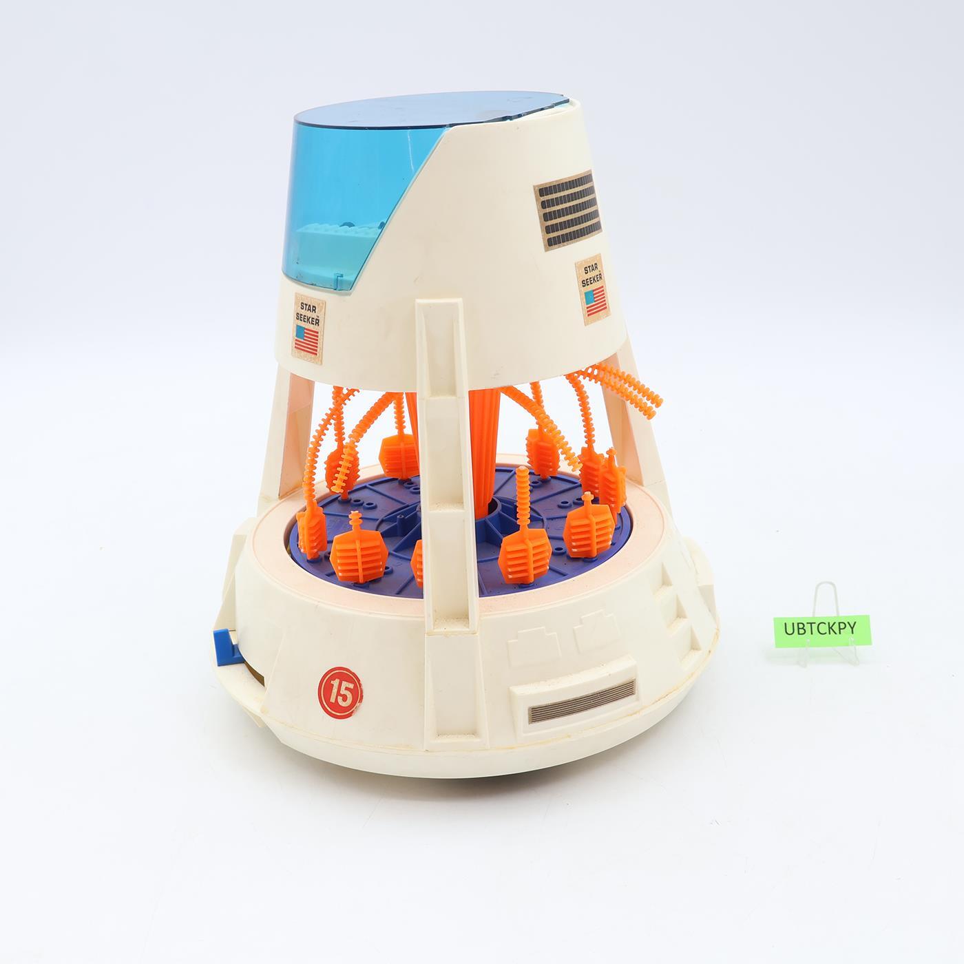 Condition: Rated 85 with light wear, needs a thorough cleaning. There are some yellow discoloration spots. The figure is dirty and needs cleaning. The windshield's hinge is cracked. Multiple orange pieces are broken. The control seat has melt marks (see last photo). I was not able to get the electronics to work, but the battery compartment is clean. Our grading scale is 1 - 100, with mint flawless a 100, near mint a 95, excellent a 90, and so on. Comes as shown.
