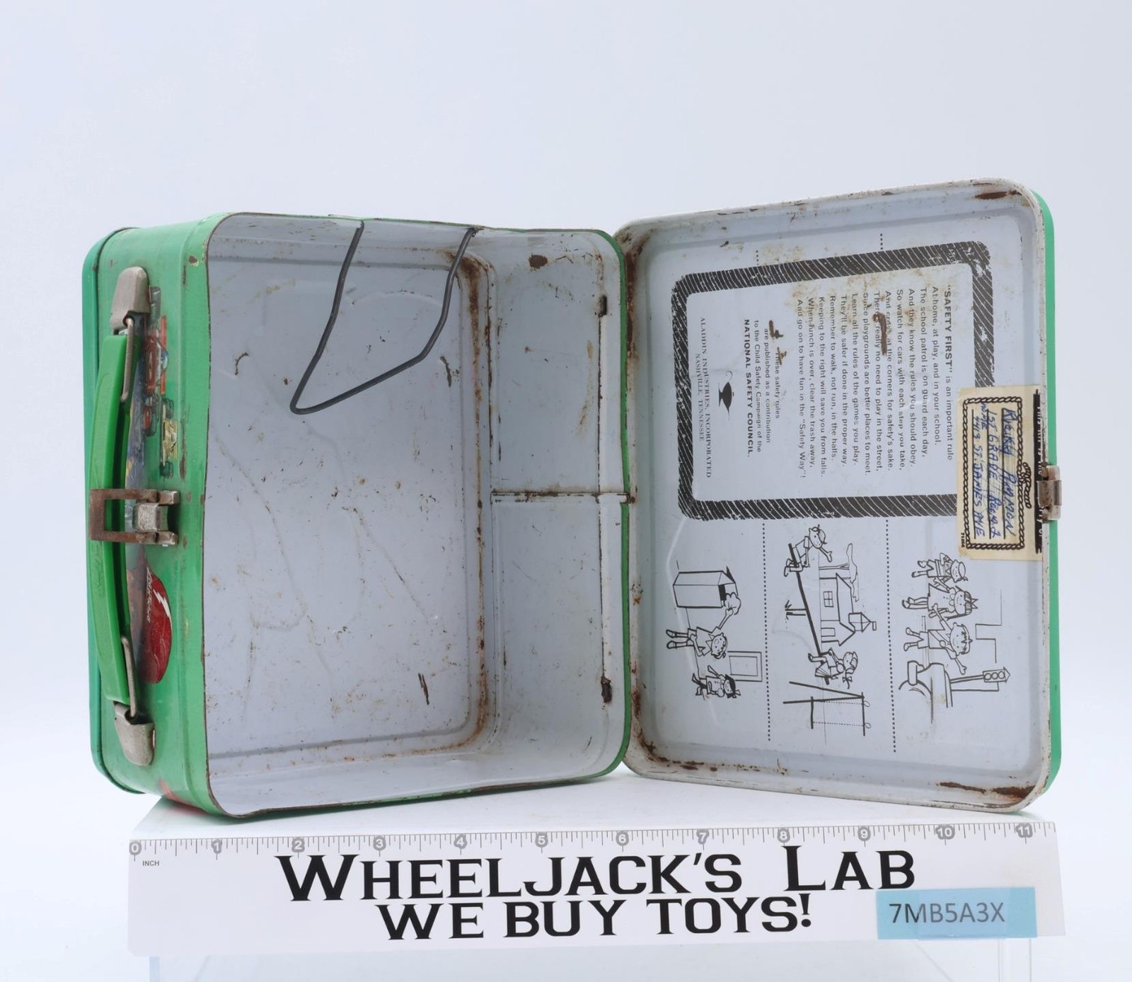 Condition: The lunchbox is made of metal. It has wear and needs cleaning. There is rust on both the inside and outside of the box. The latch, handle, and clip are intact and have rust on some of the metal portions. Comes as shown.